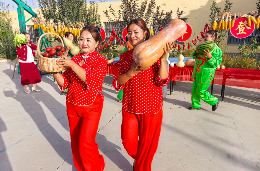 拜城县拜城镇铁提尔村“两委”联合县商务科技工信局驻村工作队,以“迎国庆 庆丰收”为主题,设置了歌舞表演、农副产品展示、趣味游戏等11个活动区域。诗词朗诵抒发爱国情怀,吃西瓜比赛、有奖套圈等趣味活动热闹非凡,展现了新时代乡村振兴的丰硕成果和各族群众的幸福生活。