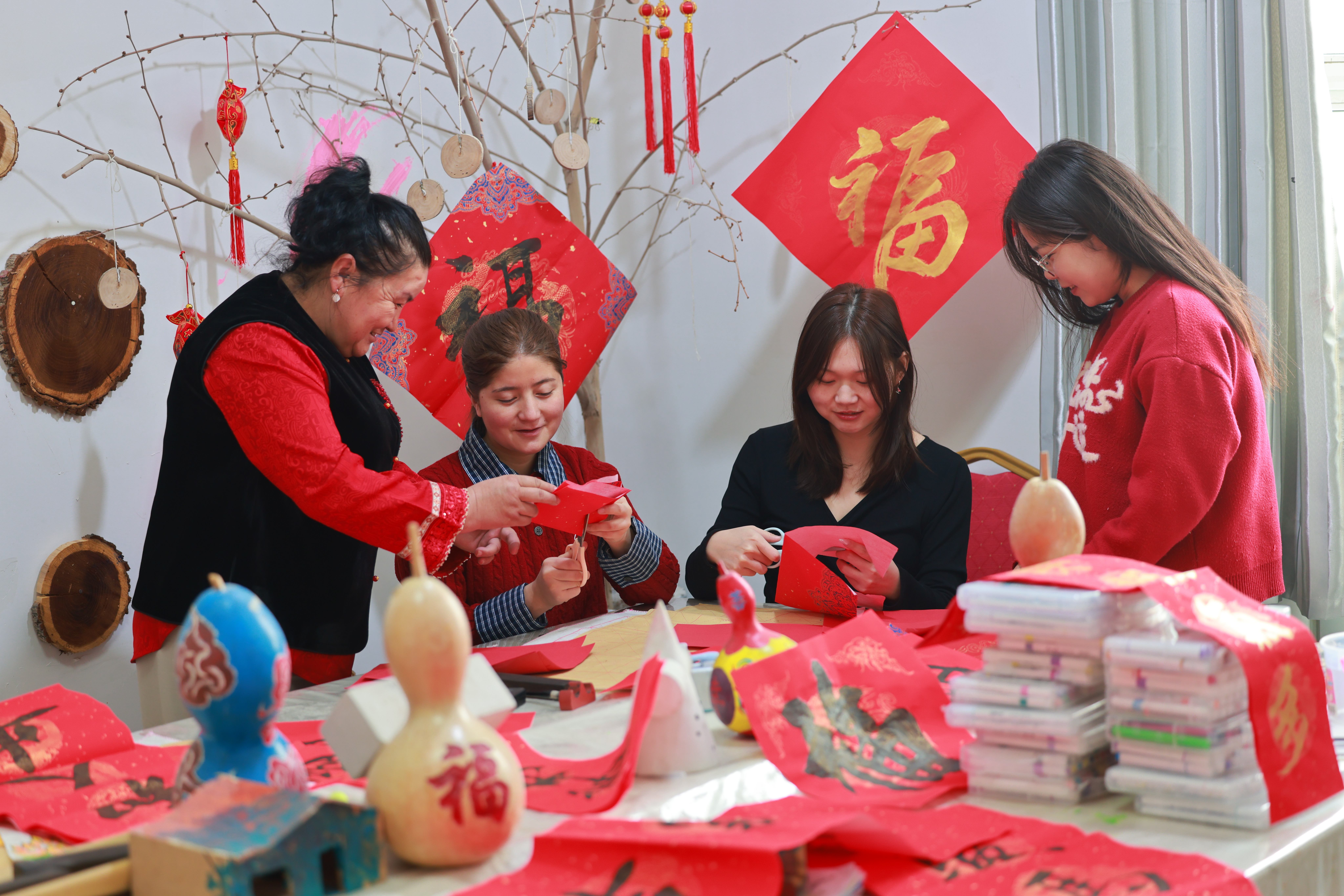 沙雅县红旗镇喀什托格拉克村“两委”联合县教育局驻村工作队,组织村干部、工作队员为群众剪窗花、写春联、贴福字、挂灯笼,把喜庆与祝福送到群众身边,村庄处处洋溢新春喜气。