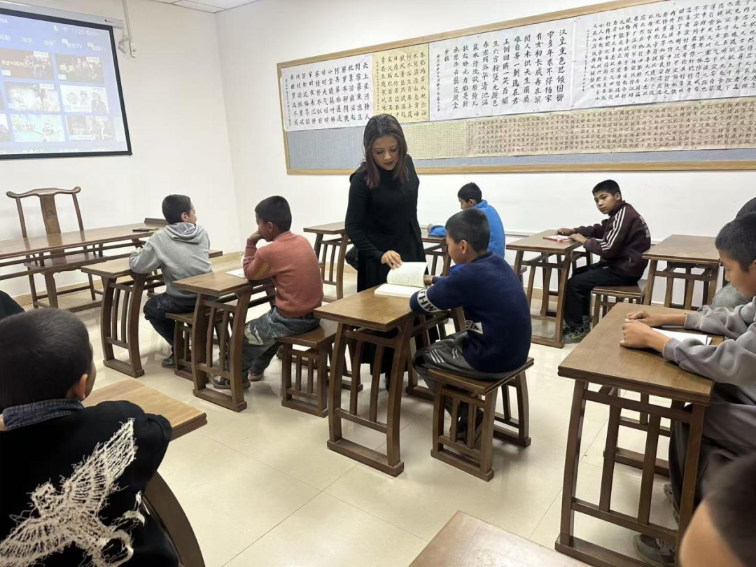 走进喀拉塔什村的“石榴籽”小课堂,教室内中式桌椅整齐排列,墙面悬挂的中华经典书法长卷营造出浓郁的文化氛围。老师俯身细致辅导学生阅读,孩子们或专注翻阅书籍,或认真记录笔记,在知识的浸润中感受中华文化的共通魅力。