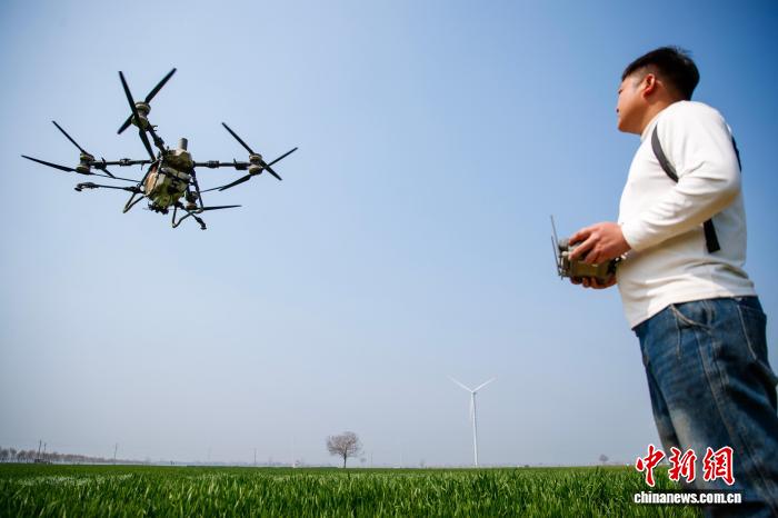 3月25日,在唐河县桐河镇的麦田里,焦强农业合作社的负责人焦强站在地头,指尖轻触手机屏幕,搭载智能设备的植保无人机便腾空而起进行作业。