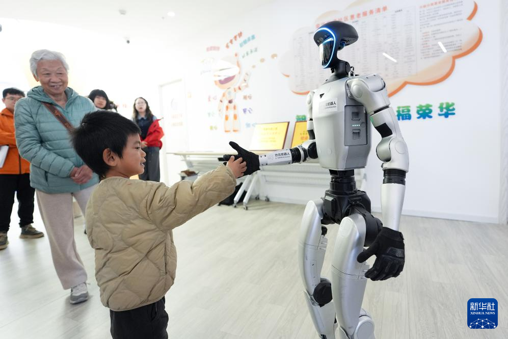 在智慧康养机器人养老驿站内,小朋友与一款人形机器人握手