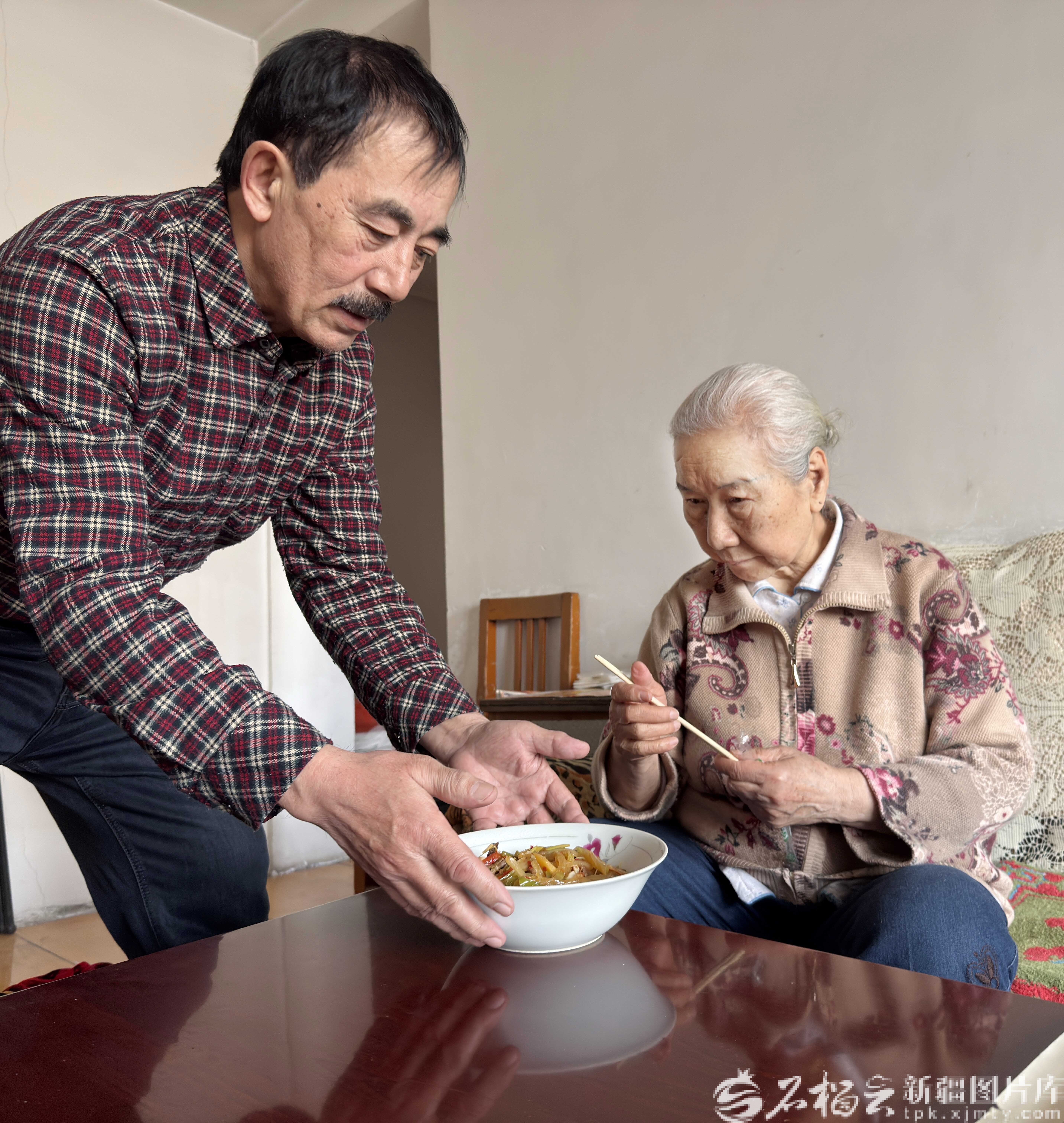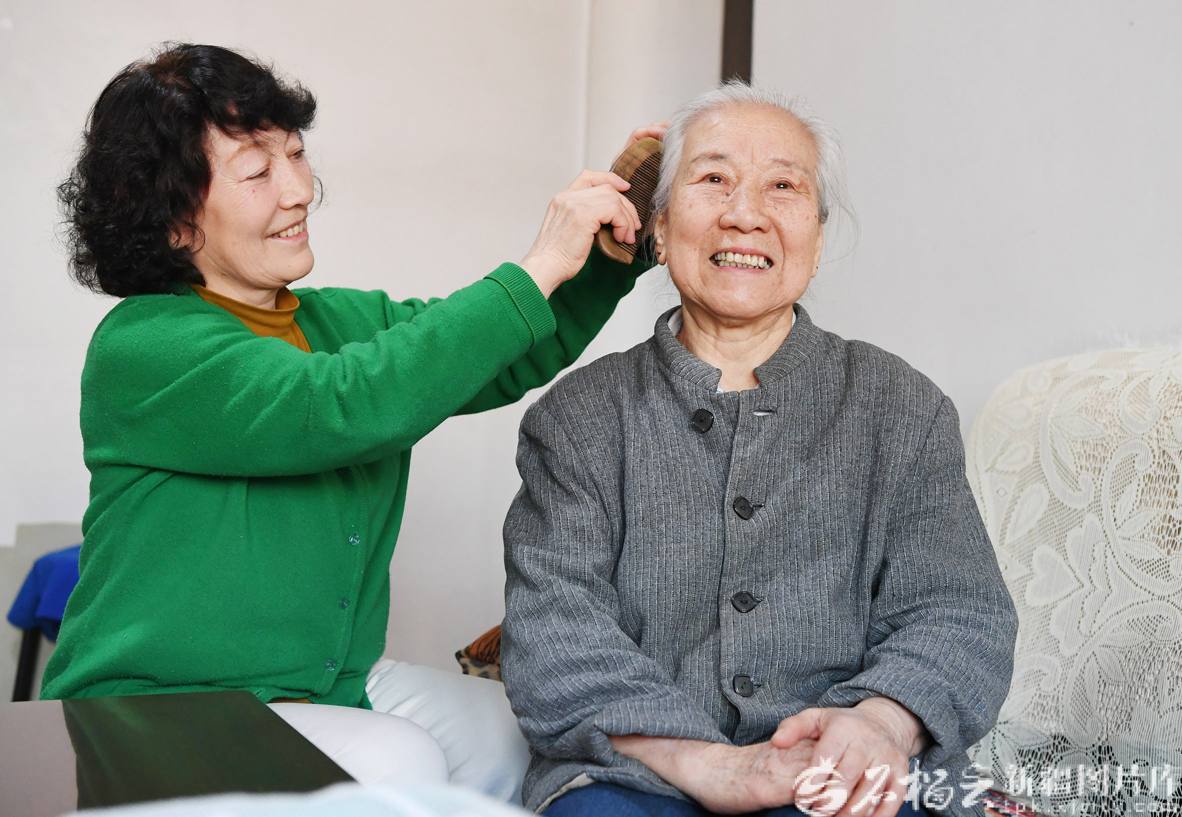 2月15日 ,在乌鲁木齐市天山区二道桥街道二道桥社区巴里坤小区马志林(右)家中,热伊汗·拍合热丁(左)帮马志林老人梳头。