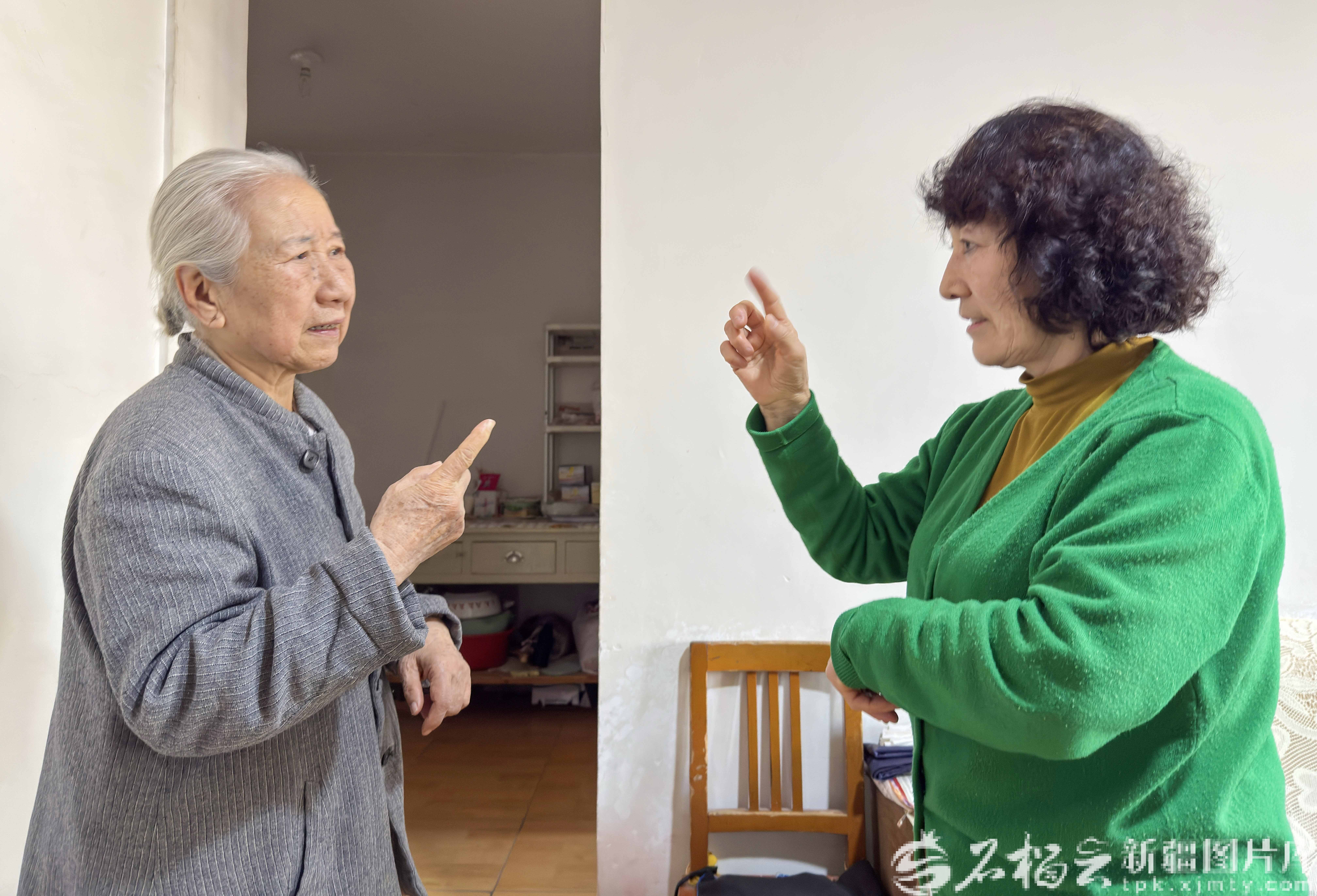 2月15日 ,在乌鲁木齐市天山区二道桥街道二道桥社区巴里坤小区马志林(左)家中,热伊汗·拍合热丁(右)和老人用手语进行交流。