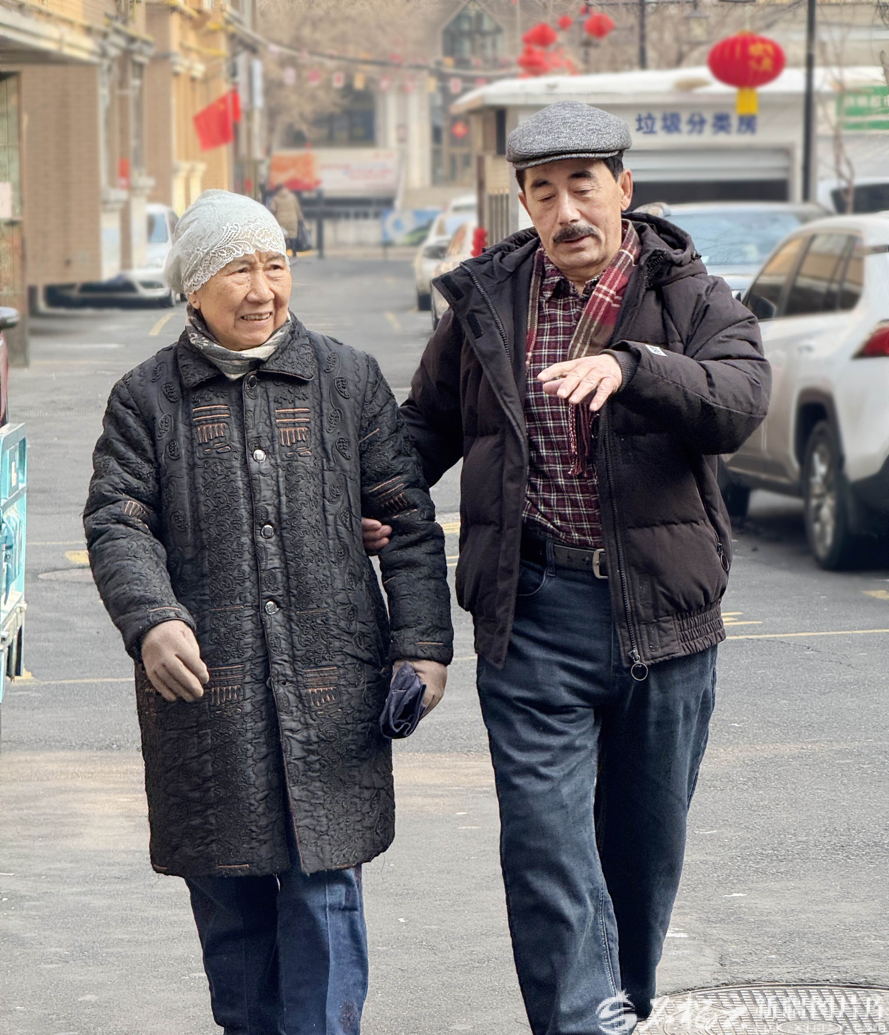 2月15日 ,热伊汗的丈夫阿布来提·帕孜力(左)陪同马志林老人散步并用手语进行交流。