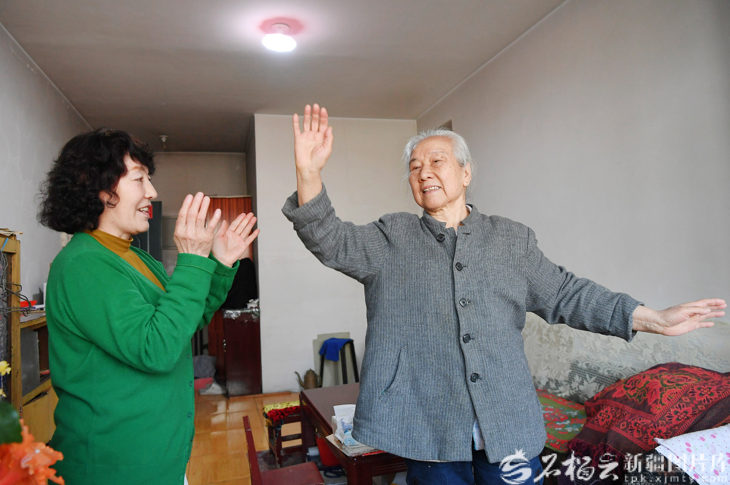 2月15日 ,在乌鲁木齐市天山区二道桥街道二道桥社区巴里坤小区马志林(右)家中,马志林老人跳起了跟热伊汗·拍合热丁(左)学的舞蹈。