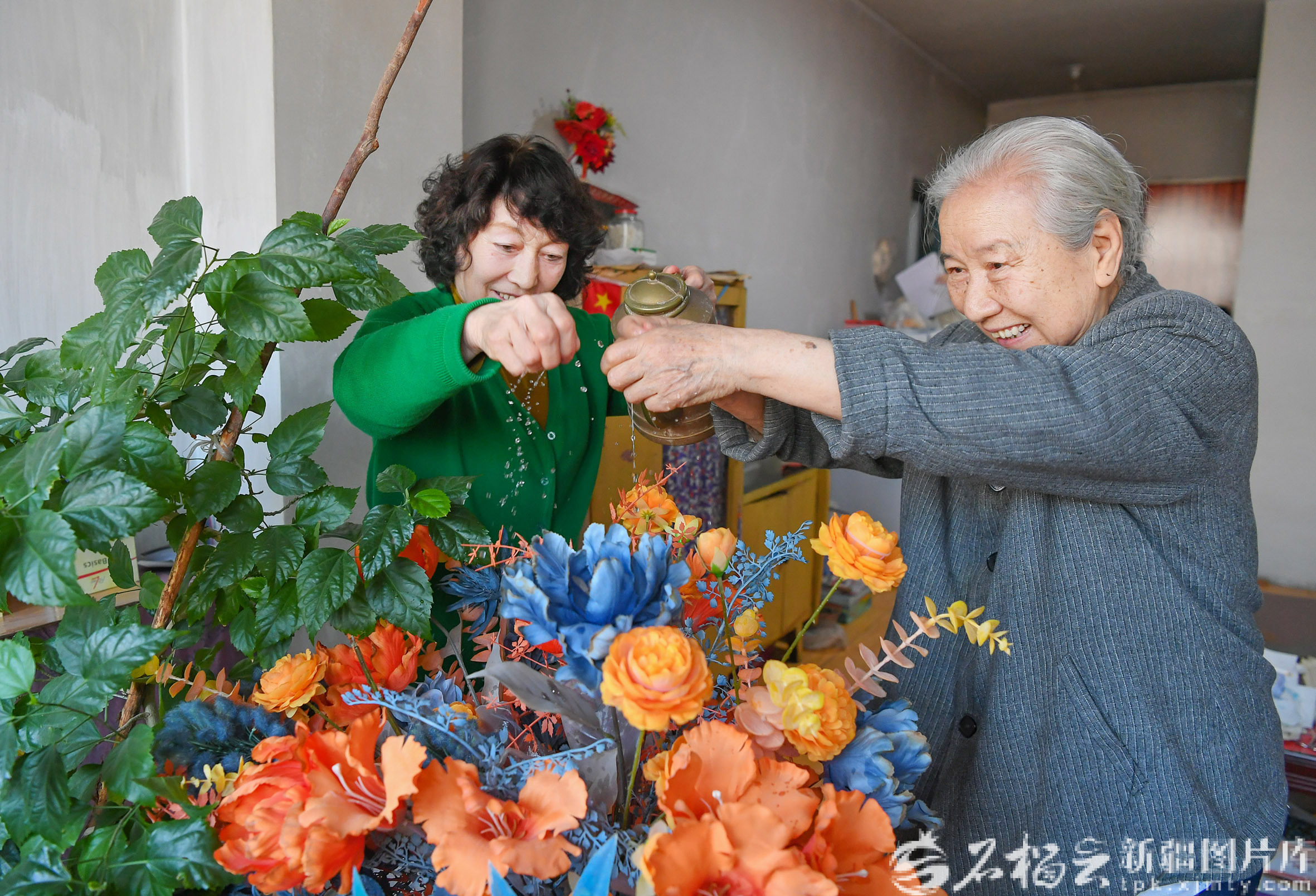 2月15日 ,在乌鲁木齐市天山区二道桥街道二道桥社区巴里坤小区马志林(右)家中,热伊汗·拍合热丁(左)和老人一起浇花。