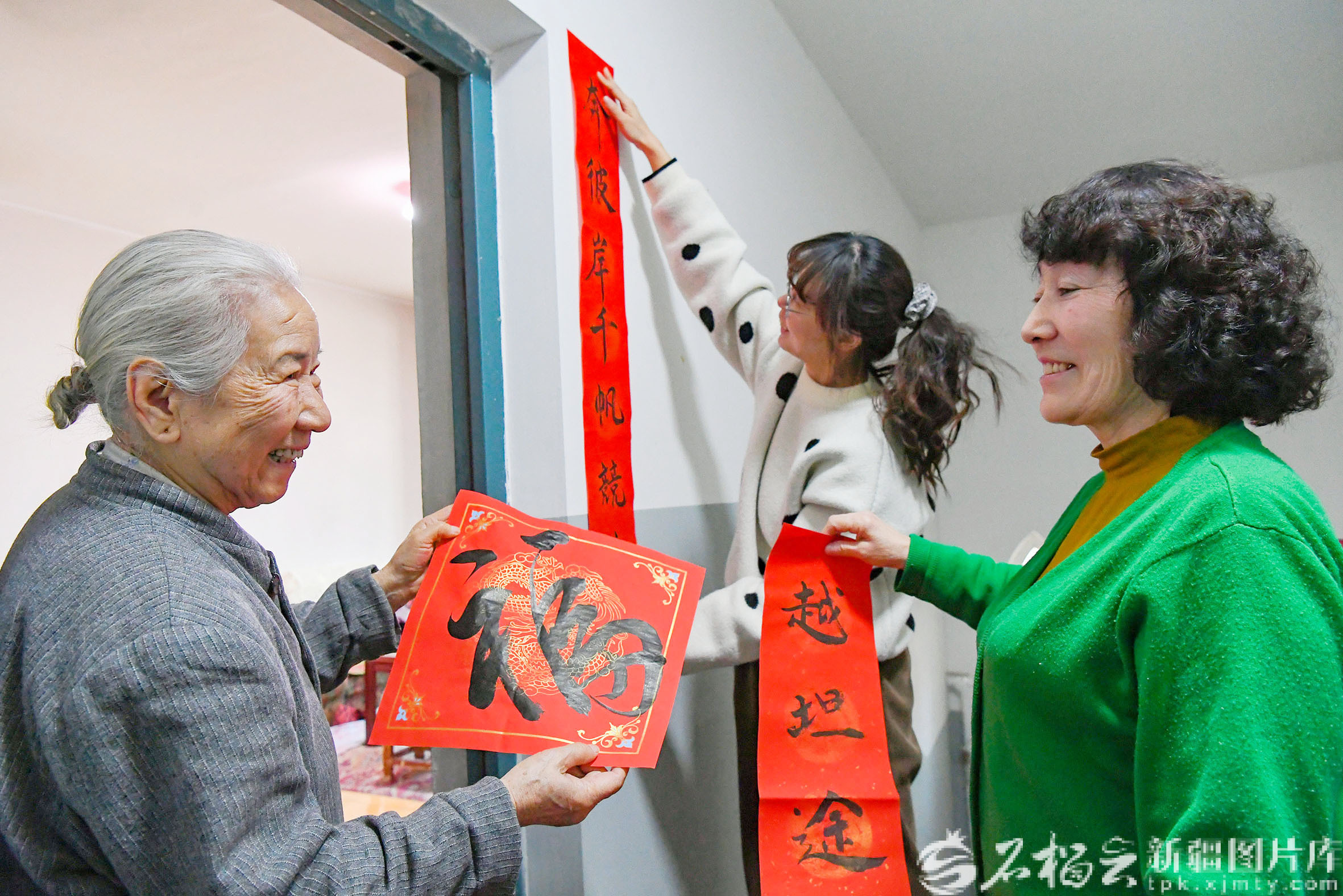2月15日 ,在乌鲁木齐市天山区二道桥街道二道桥社区巴里坤小区热伊汗·拍合热丁(右)和社区干部帮马志林(左)贴春联。