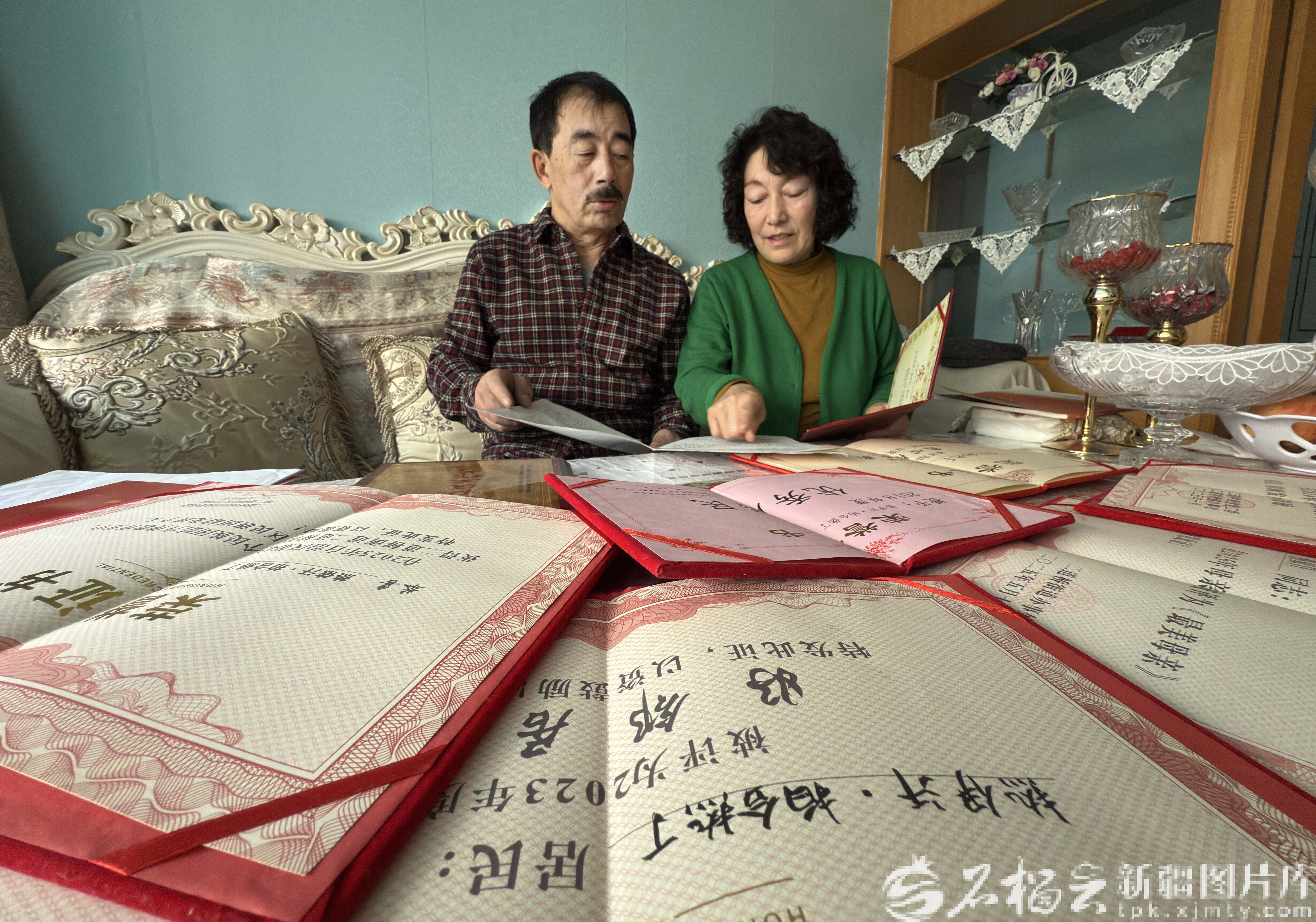 2月15日 ,热伊汗·拍合热丁和丈夫阿布来提·帕孜力在家中整理多年来两人获得的荣誉证书。