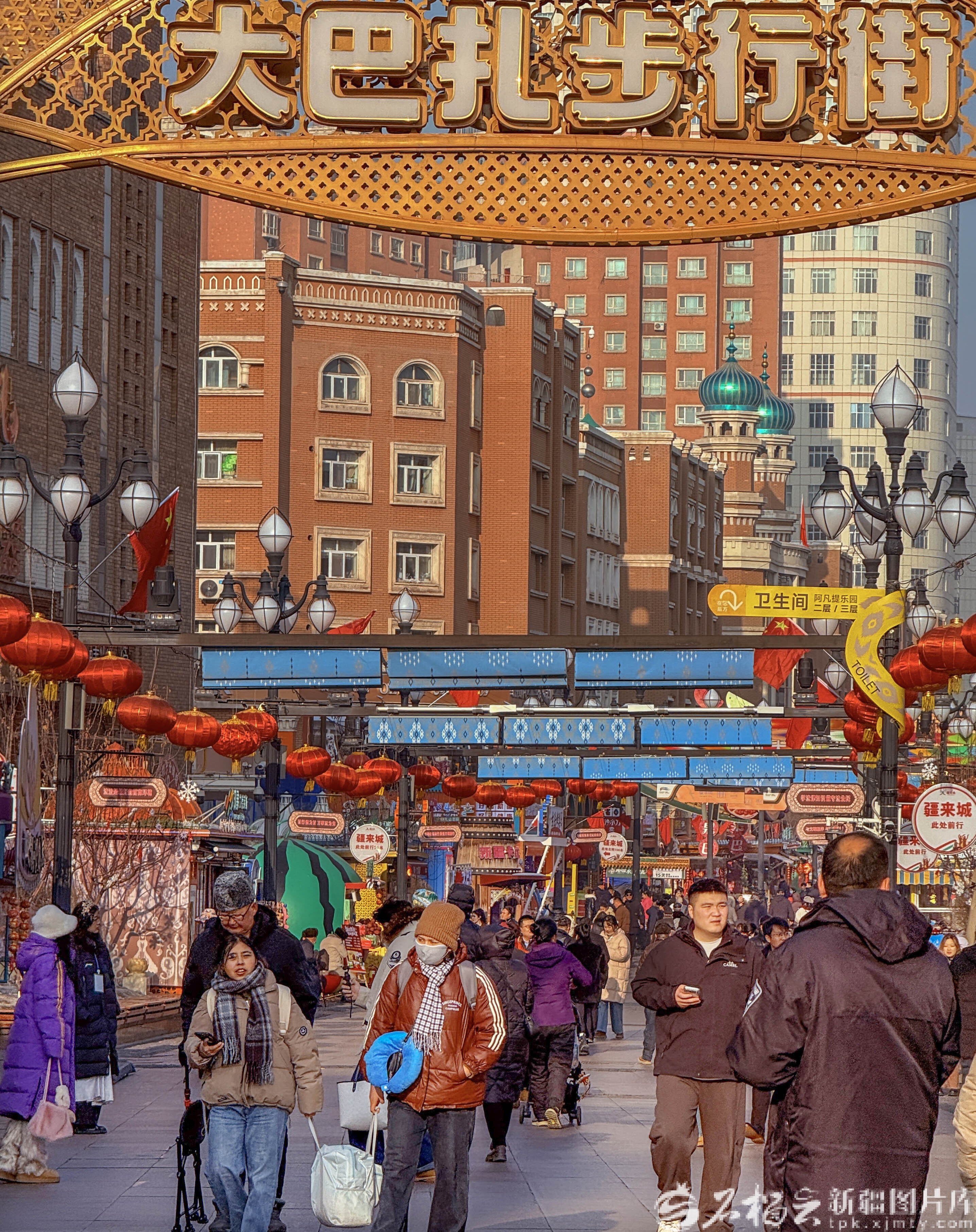 1月8日,游客在新疆国际大巴扎步行街拍照打卡。
