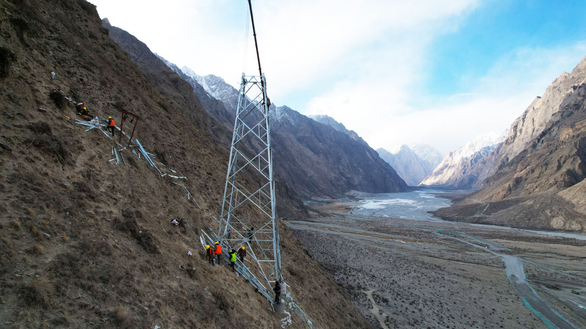 3月17日,在G219线昭苏至温宿公路建设配套工程西天山隧道出口110千伏输变电建设现场,施工人员在悬崖峭壁间开展电力铁塔组装作业,拼接、吊装、组塔等一气呵成。