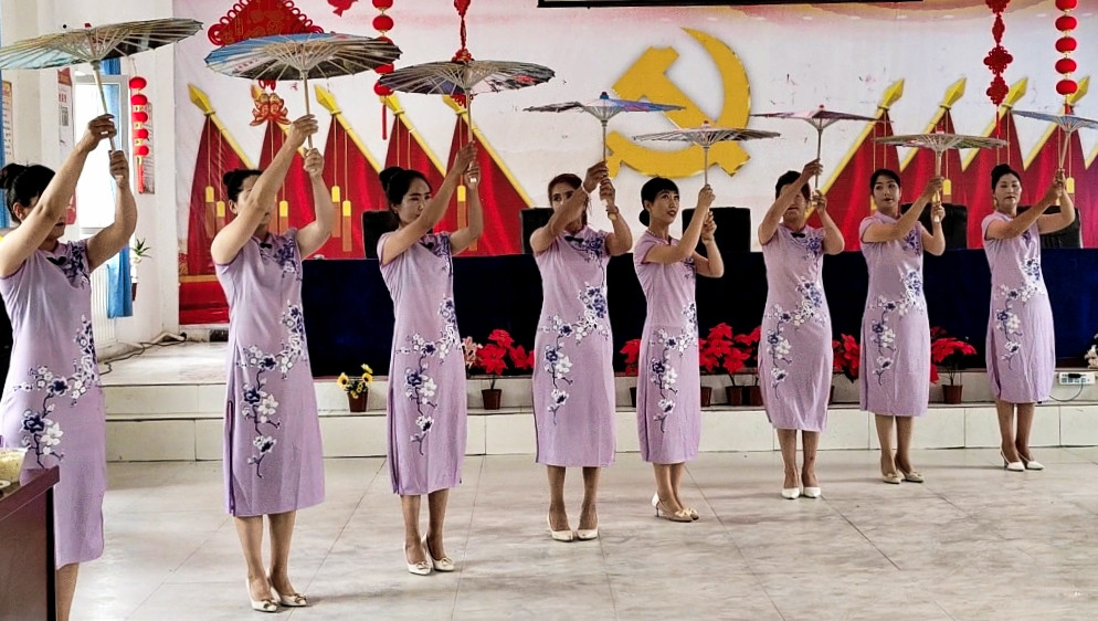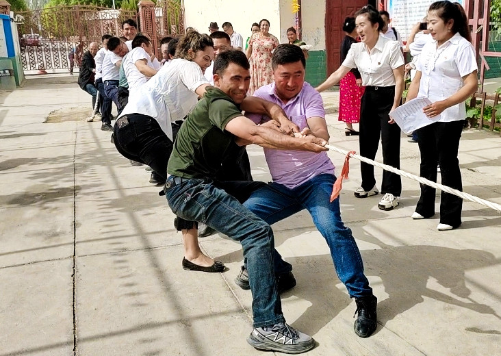 在体育竞赛场地,机关干部和村民分组开展篮球、乒乓球、跳绳、拔河比赛,现场气氛热烈,呐喊声、加油声此起彼伏,掌声和欢呼声不绝于耳,参赛队员们本着友谊第一、比赛第二、重在参与的理念,用矫健的身姿诠释着运动的魅力,同时在运动中增进友谊和团结合作意识。精彩的文艺演出在集体舞《雨伞舞》开始,模特旗袍秀、塔里木歌舞团的舞蹈、健美操、国通语认读小游戏等精彩节目陆续上演,为各族群众献上一场文艺盛宴,充分展现各族群众团结一心的时代风貌。