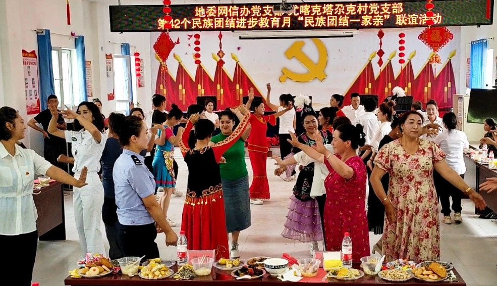 阿克苏新闻网/地区融媒体中心讯(通讯员 覃志刚)为深化自治区第42个民族团结进步教育月活动,让各民族干部群众在交往交流交融中,进一步铸牢中华民族共同体意识。5月16日,阿克苏地委网信办机关干部和温宿县吐木秀克镇尤喀克塔尕克村党员、群众欢聚一堂,共同开展地委网信办党支部、尤喀克塔尕克村党支部第42个民族团结进步教育月民族团结一家亲联谊活动,近200余名各族群众参加此次活动。