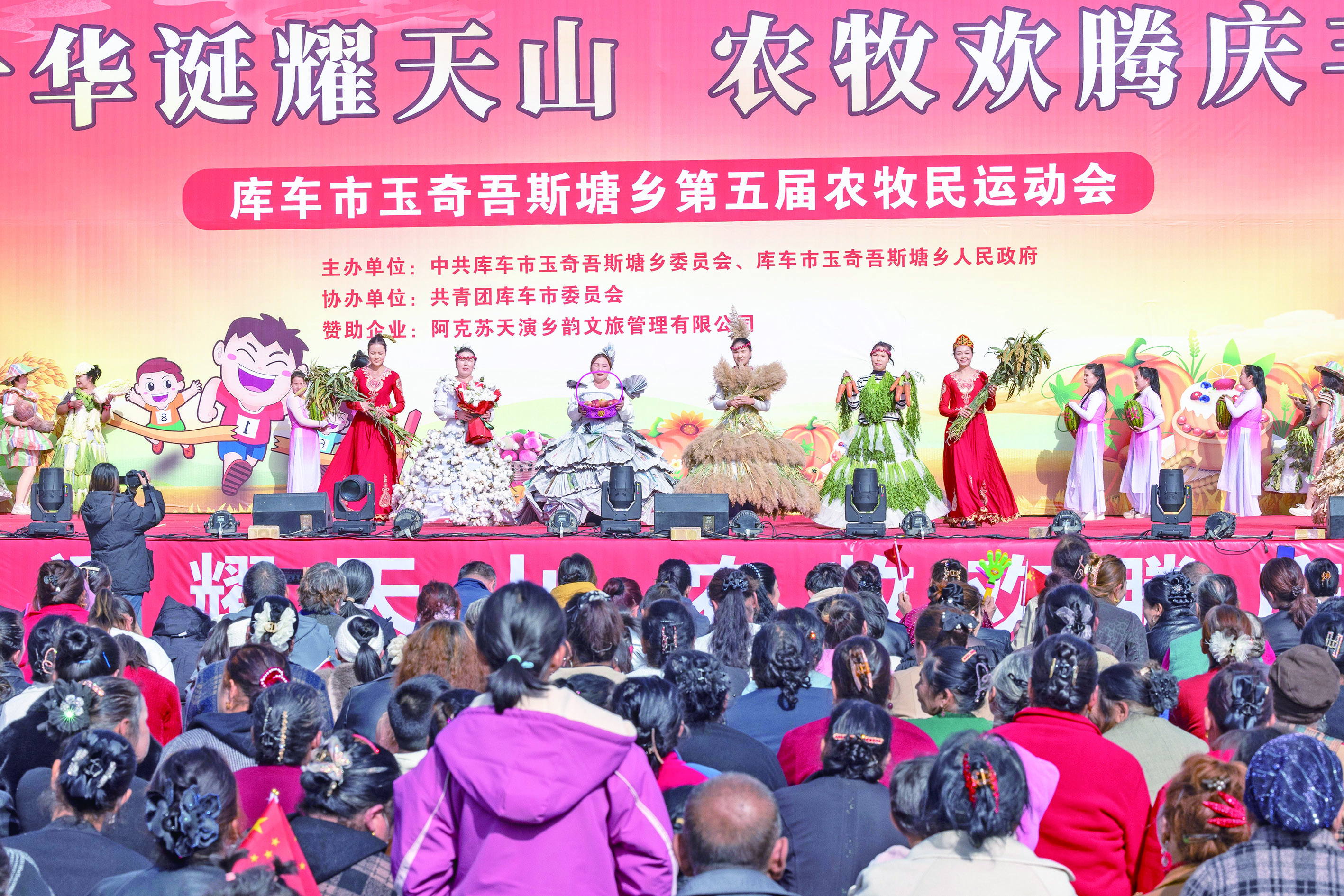 10月18日,库车市玉奇吾斯塘乡举行以“七十华诞耀天山 农牧欢腾庆丰年”为主题的农牧民运动会,来自各村的群众身穿用辣椒、豆角、玉米等农作物和蔬菜制作的服饰走秀,展示秋季丰收的喜悦和甜美生活的幸福。 通讯员 袁欢欢 摄