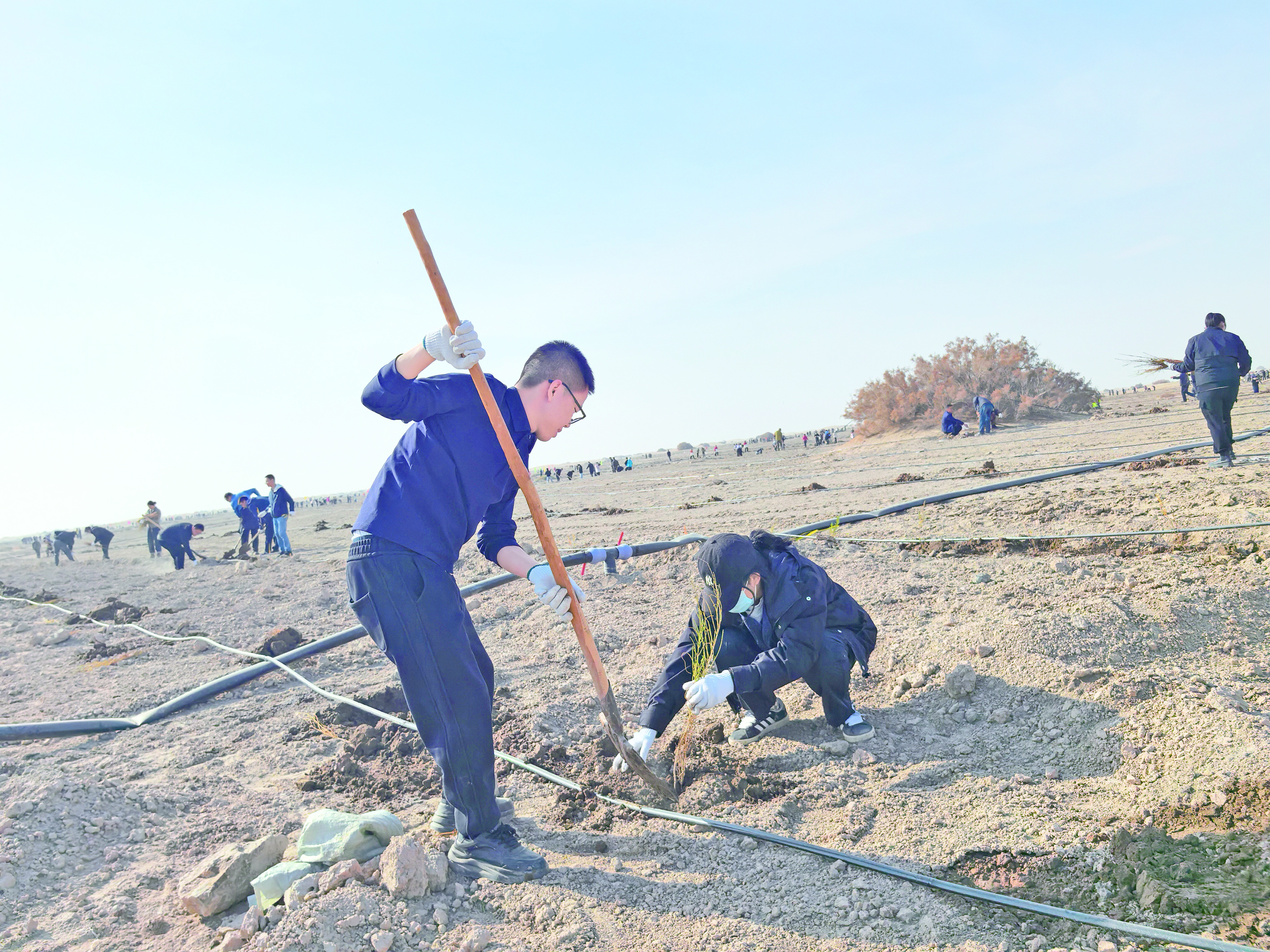 浙江省援疆指挥部干部在栽树苗。 记者 卢昱豪 摄