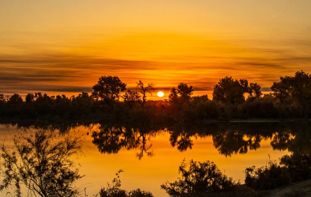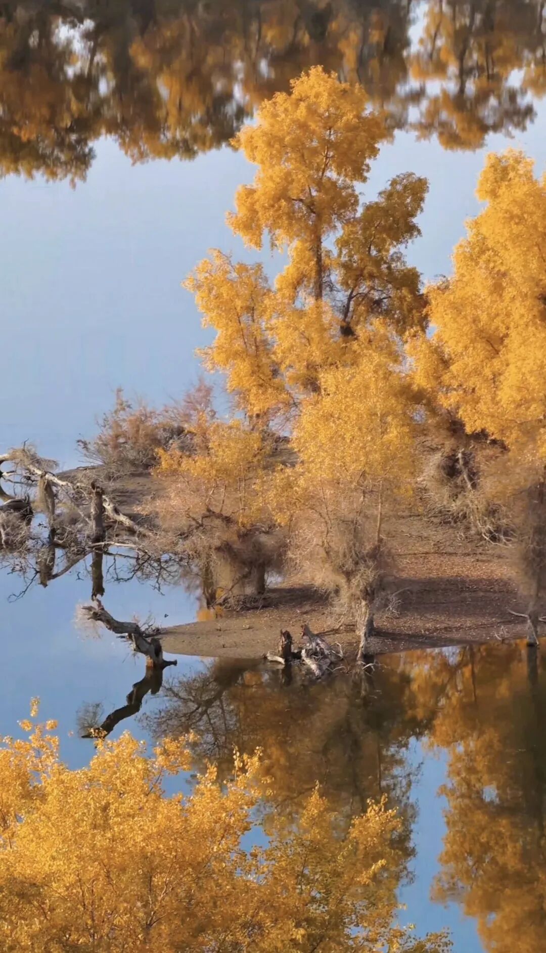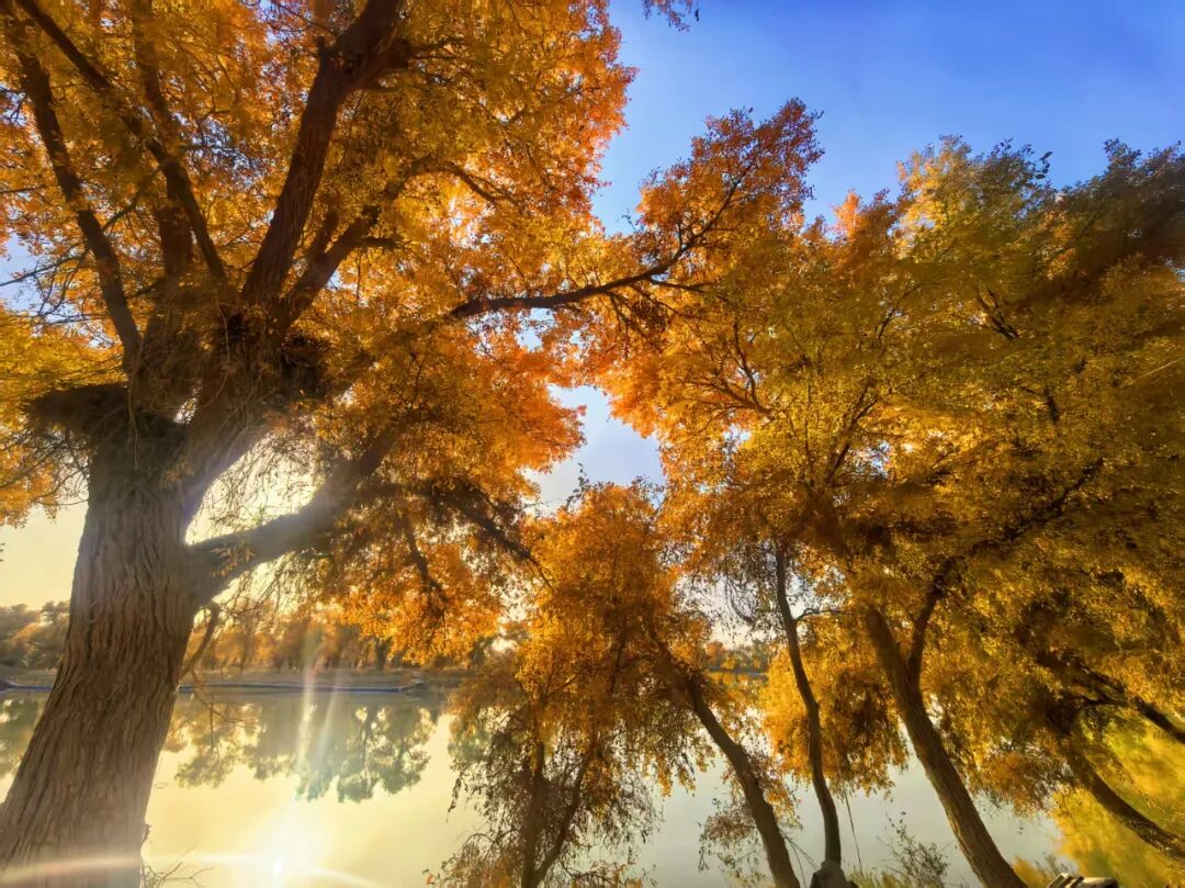 不同于其他地区的干旱胡杨,沙雅胡杨林紧依塔里木河。有水的地方就有灵气 —— 金黄的胡杨倒映在碧绿的河面上,偶尔有飞鸟掠过,动静结合的画面,随手拍都是 “电影感”。