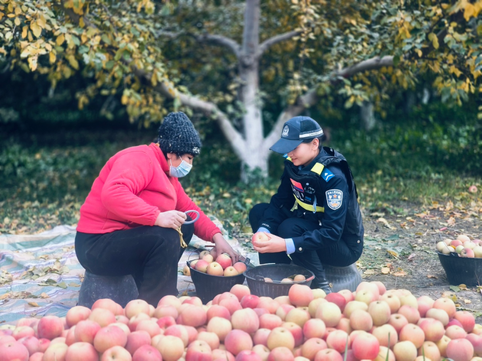 11月5日,阿克苏市公安局柳源镇派出所民警帮助村民采摘苹果。通讯员 何莉 摄