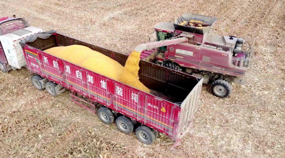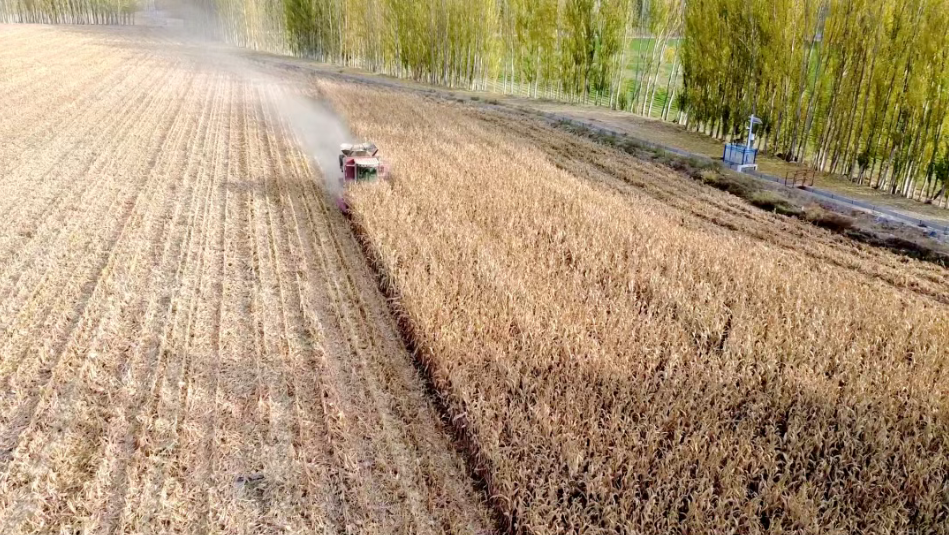 近日,在拜城县亚吐尔乡库木买里村的玉米地里,大型联合收割机穿梭作业,摘穗、脱粒、秸秆粉碎一气呵成,展现现代农业高效图景。通讯员 高娇娇 摄