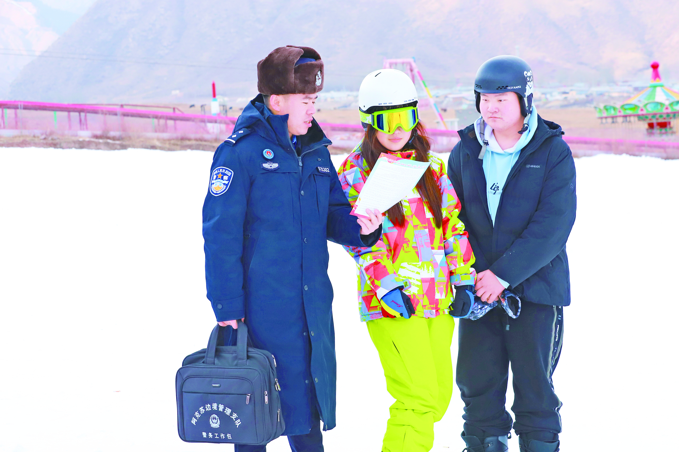 12月21日,阿克苏边境管理支队塔格拉克边境派出所民警为游客发放禁毒、反诈等宣传材料。 通讯员 王举南 摄