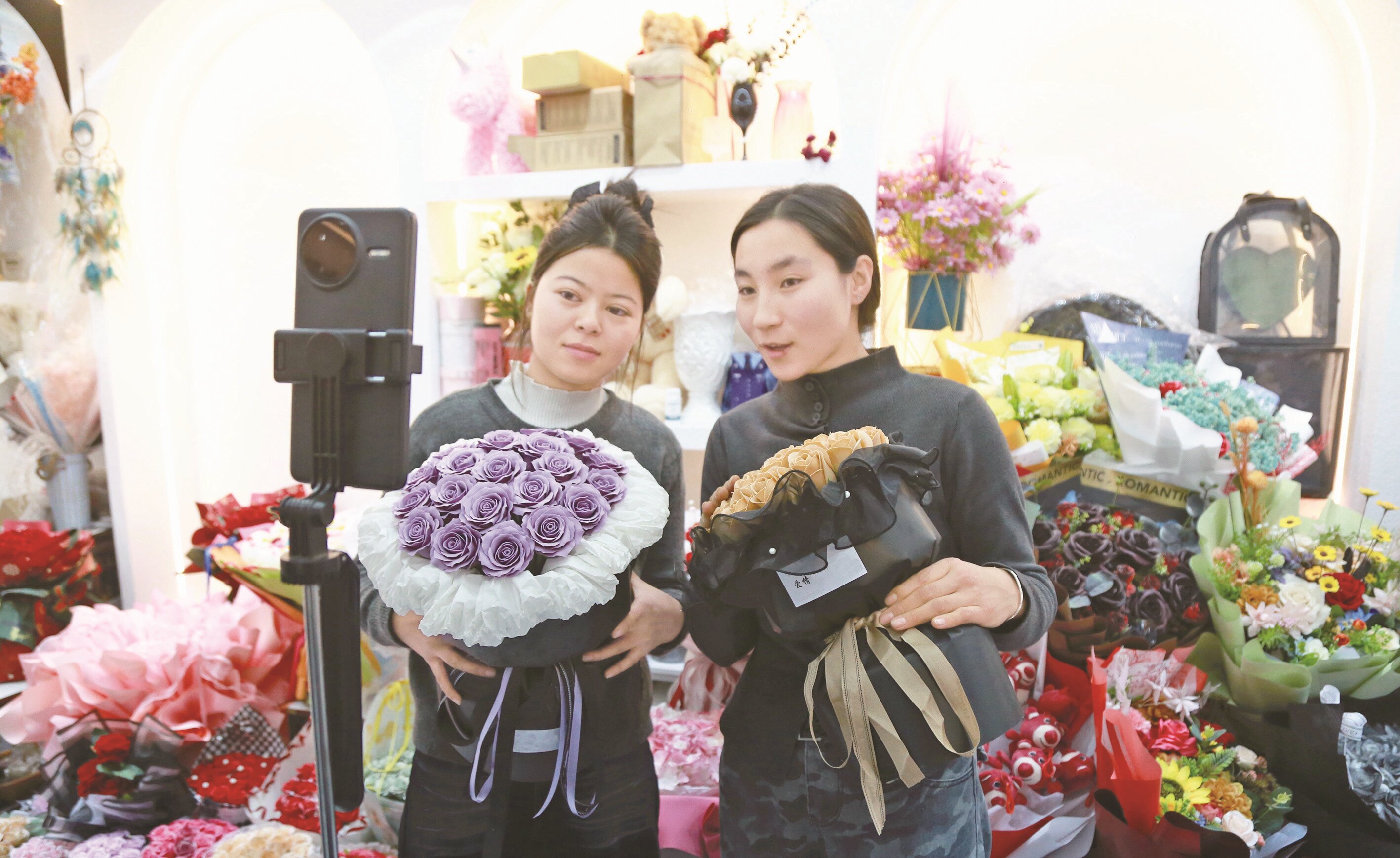 12月25日,阿瓦提县阿瓦提镇锦绣社区一家花艺店员工通过直播销售花卉。近年来,该县积极探索“直播+助农+电商”模式,组织电商人才借助电商平台开展直播带货,将长绒棉、特色林果等产品推向更广阔的市场,有效拓宽农产品销售渠道。