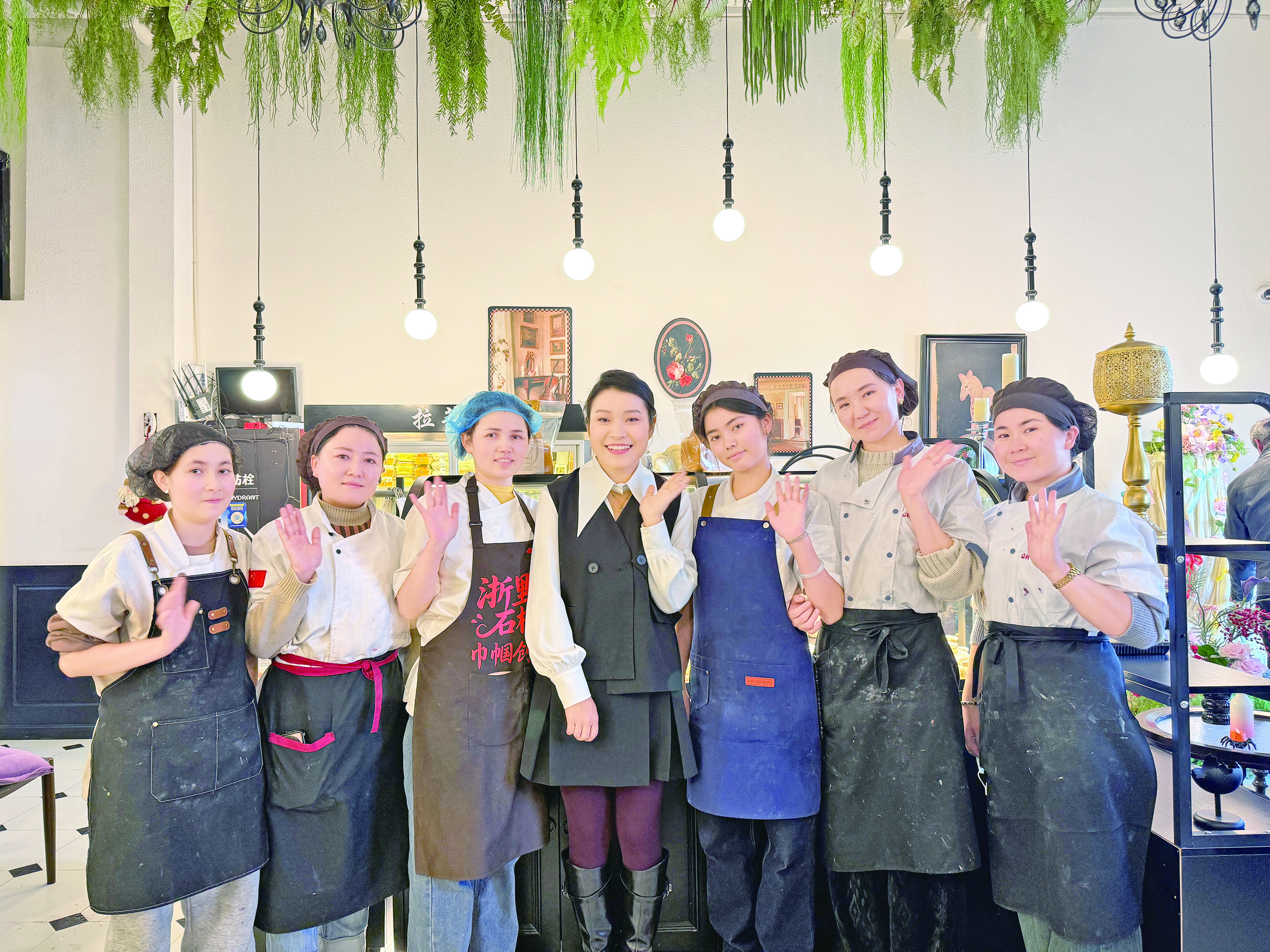 热孜艳·卡哈(中)和甜品店的员工们。
