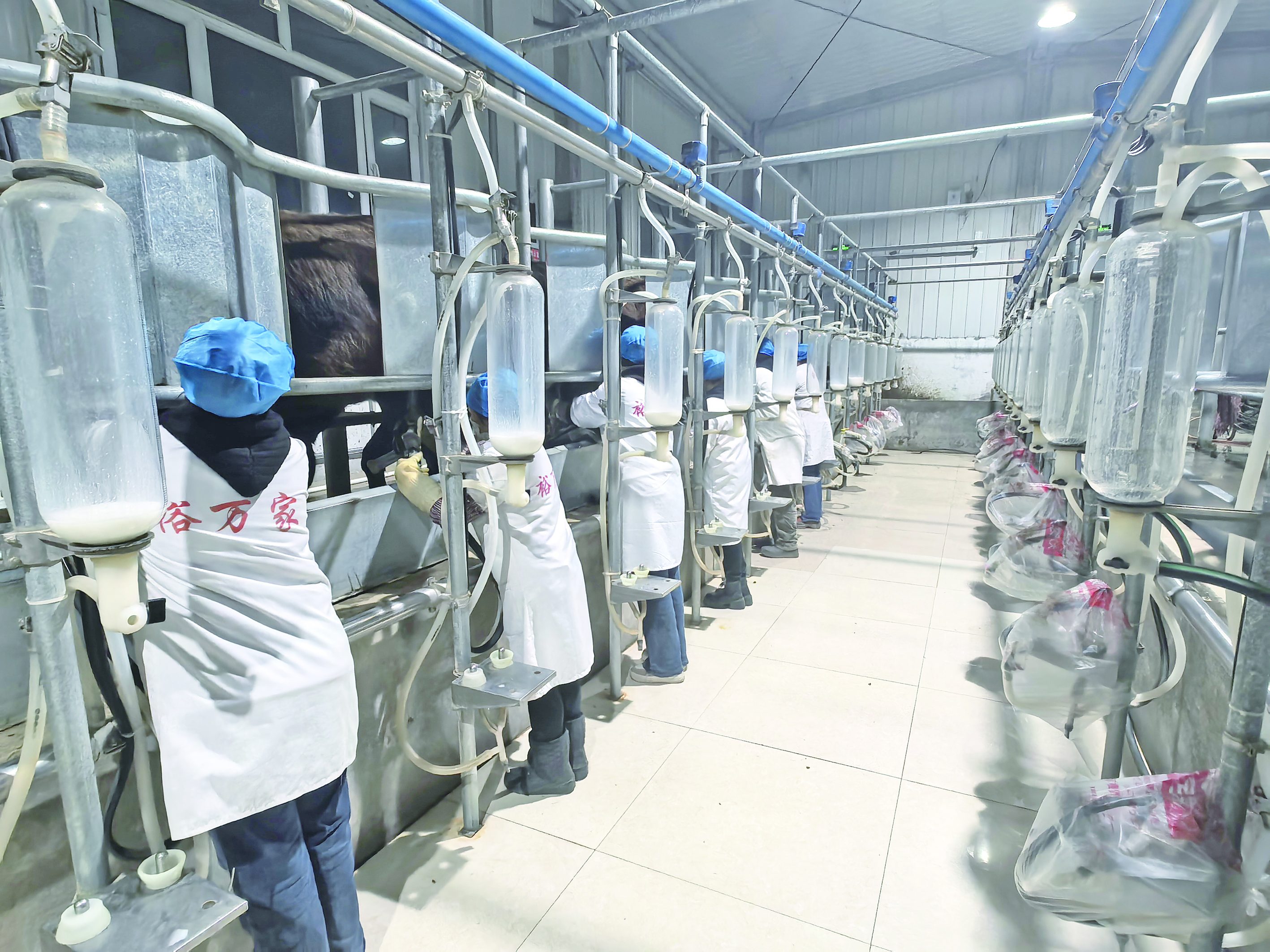 1月8日,库车裕万家畜禽养殖农民专业合作社奶驴养殖基地挤奶厅,工作人员正操作标准化挤奶设备。