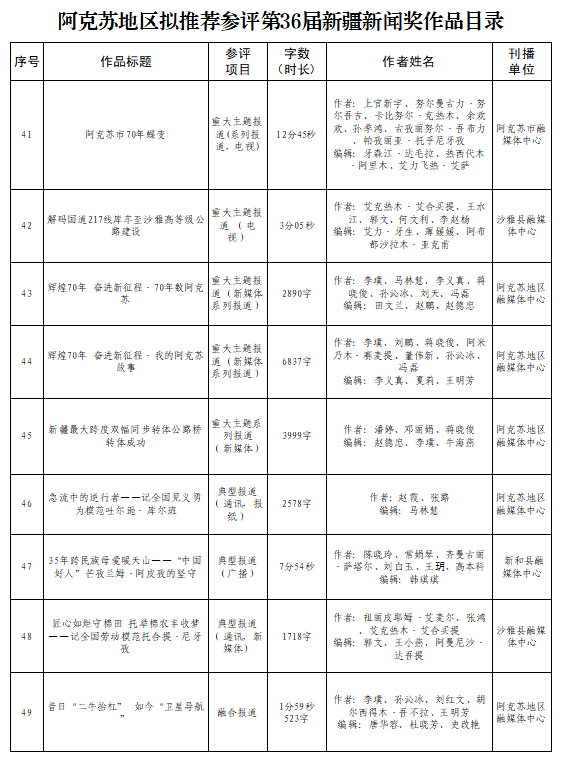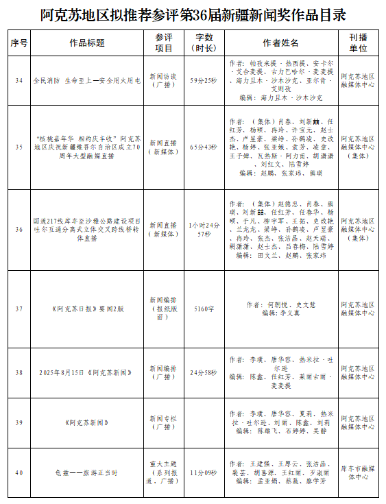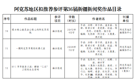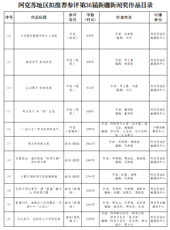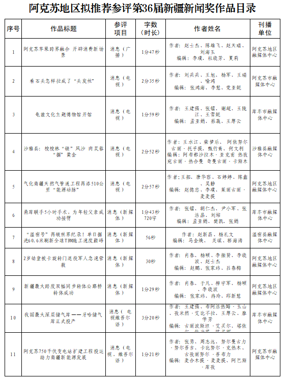 根据《新疆新闻奖评选办法》和《关于开展第36届新疆新闻奖评选工作的通知》要求,现对参评第36届新疆新闻奖阿克苏地区初评推荐新闻作品进行公示,欢迎社会各界监督、评议。