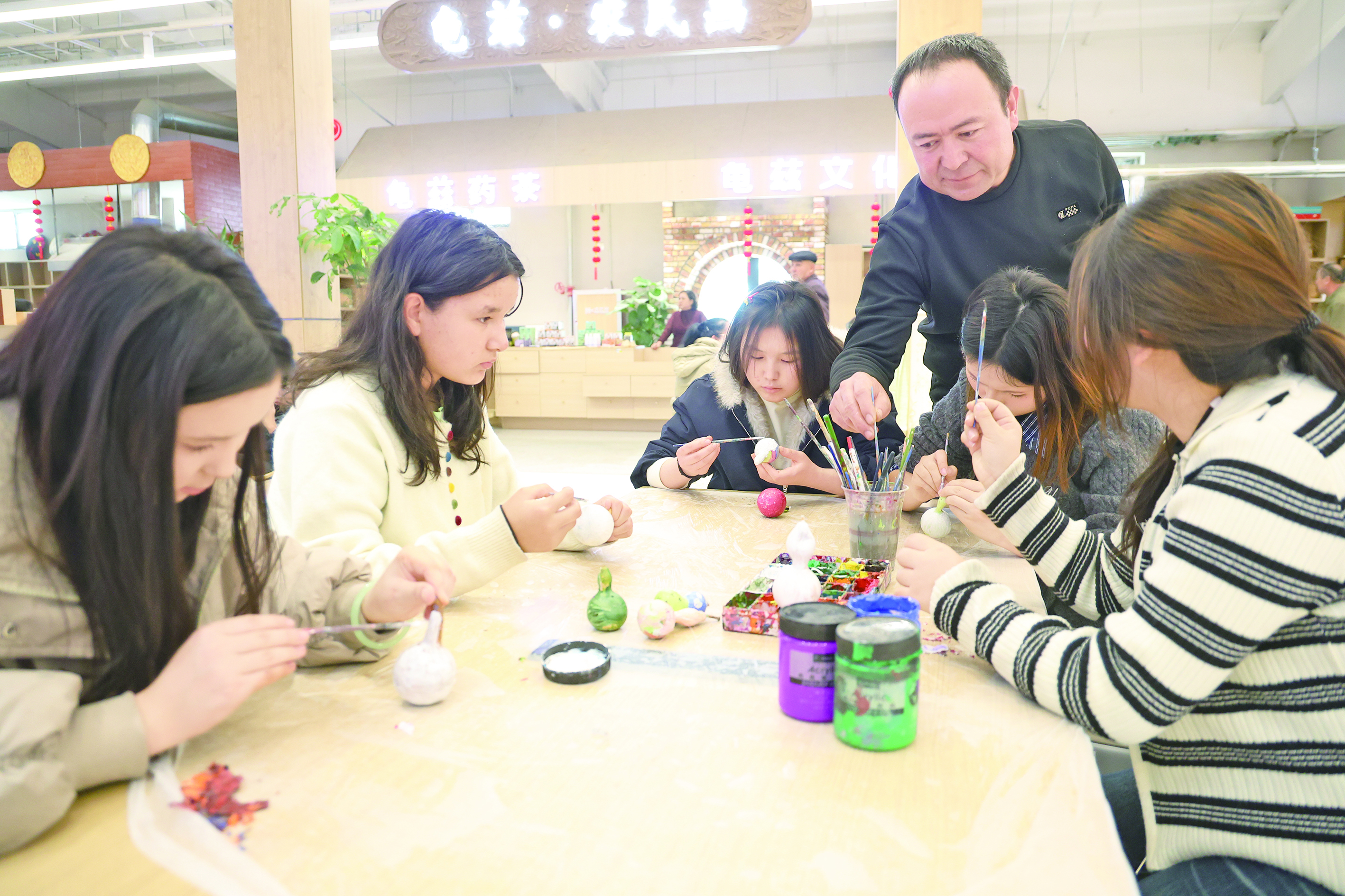 2月20日,游客在库车市龟兹非遗工坊体验土陶、葫芦绘画等制作技艺。通讯员 李银琼 摄