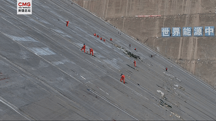 100多名施工人员在大坝坡面有序分工
