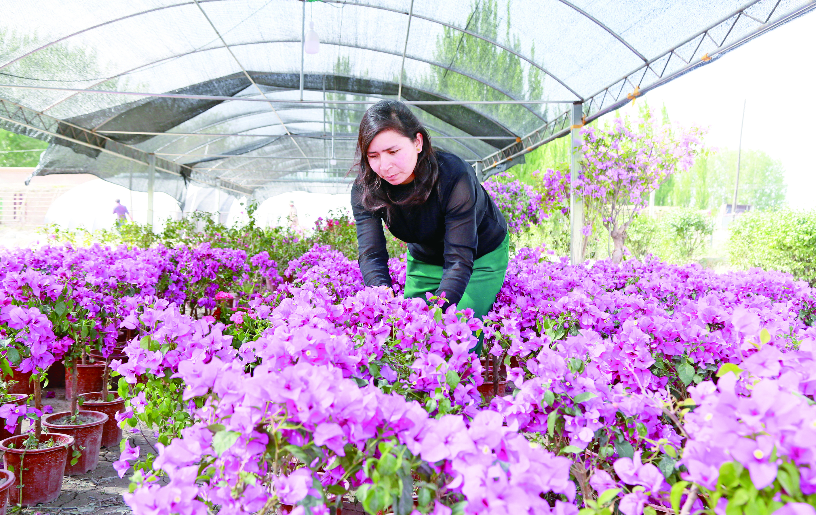4月13日,在阿瓦提县乌鲁却勒镇红旗村花卉种植基地,花农正在忙着对三角梅进行管护。近年来,阿瓦提县坚持党建引领乡村振兴,积极调整农业产业结构,引导农民开展花卉特色种植,推行“党支部+合作社+订单种植+基地+农户”模式,助力群众增收致富。