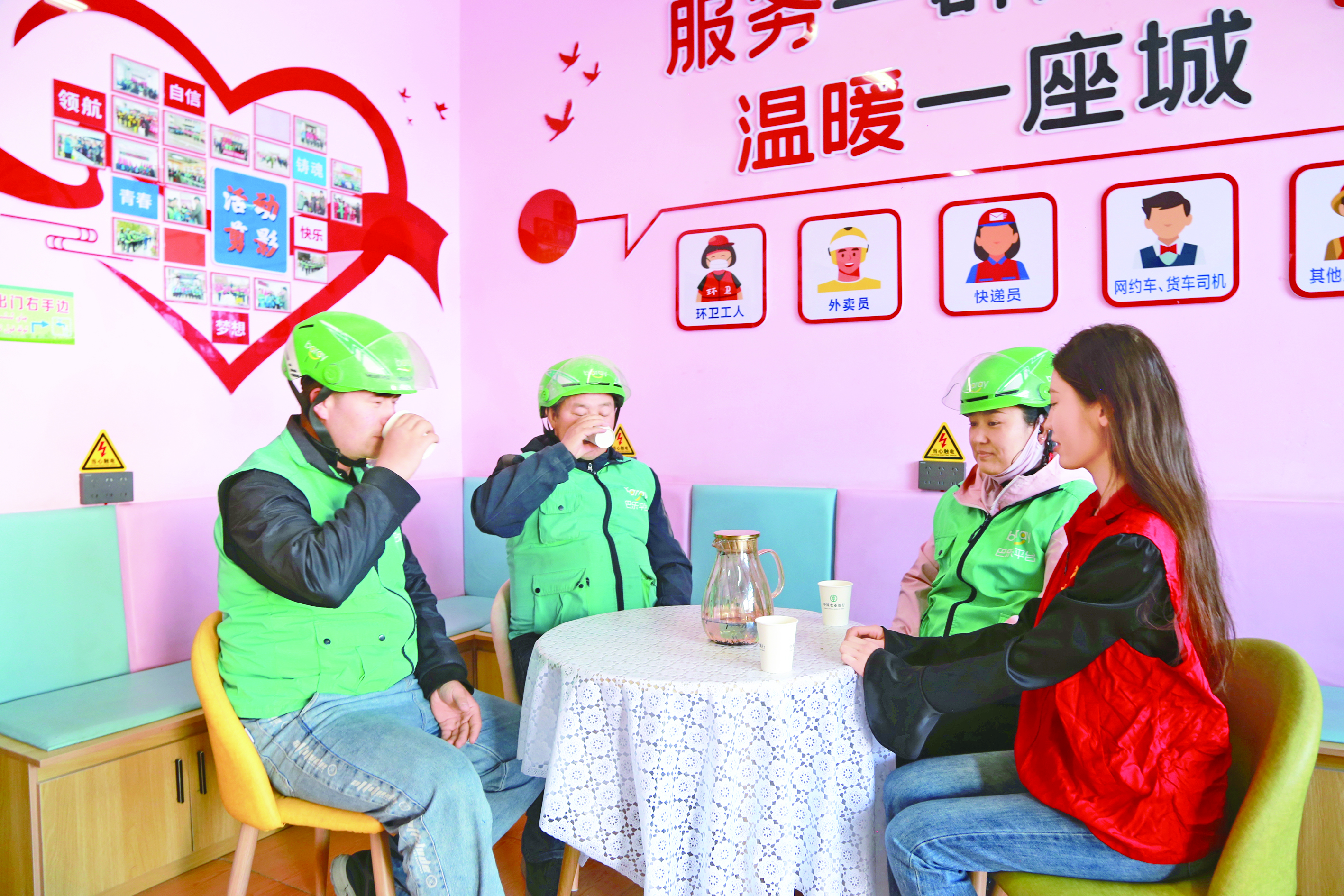 4月13日,在阿瓦提县阿瓦提镇阳光社区暖“新”工会驿站,户外劳动者在饮用志愿者送上的热茶。据了解,阿瓦提县总工会在城区、火车站、园区等地建设工会驿站,为户外劳动者提供取暖、饮水、餐食加热等服务。通讯员 包良廷 摄