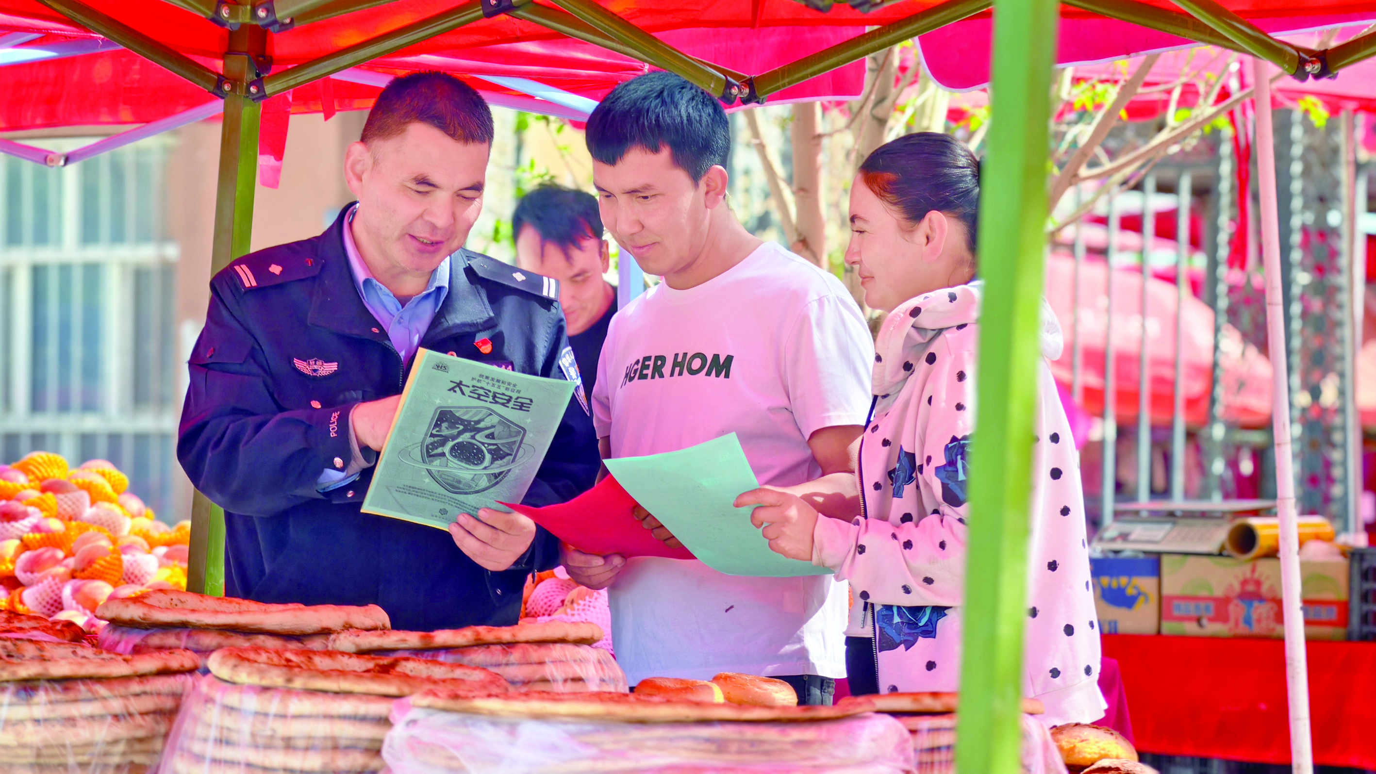 4月13日,新和县公安局渭干乡派出所组织民警走进辖区集市,开展国家安全普法宣传活动。 通讯员 罕阿依谢木·艾力 摄
