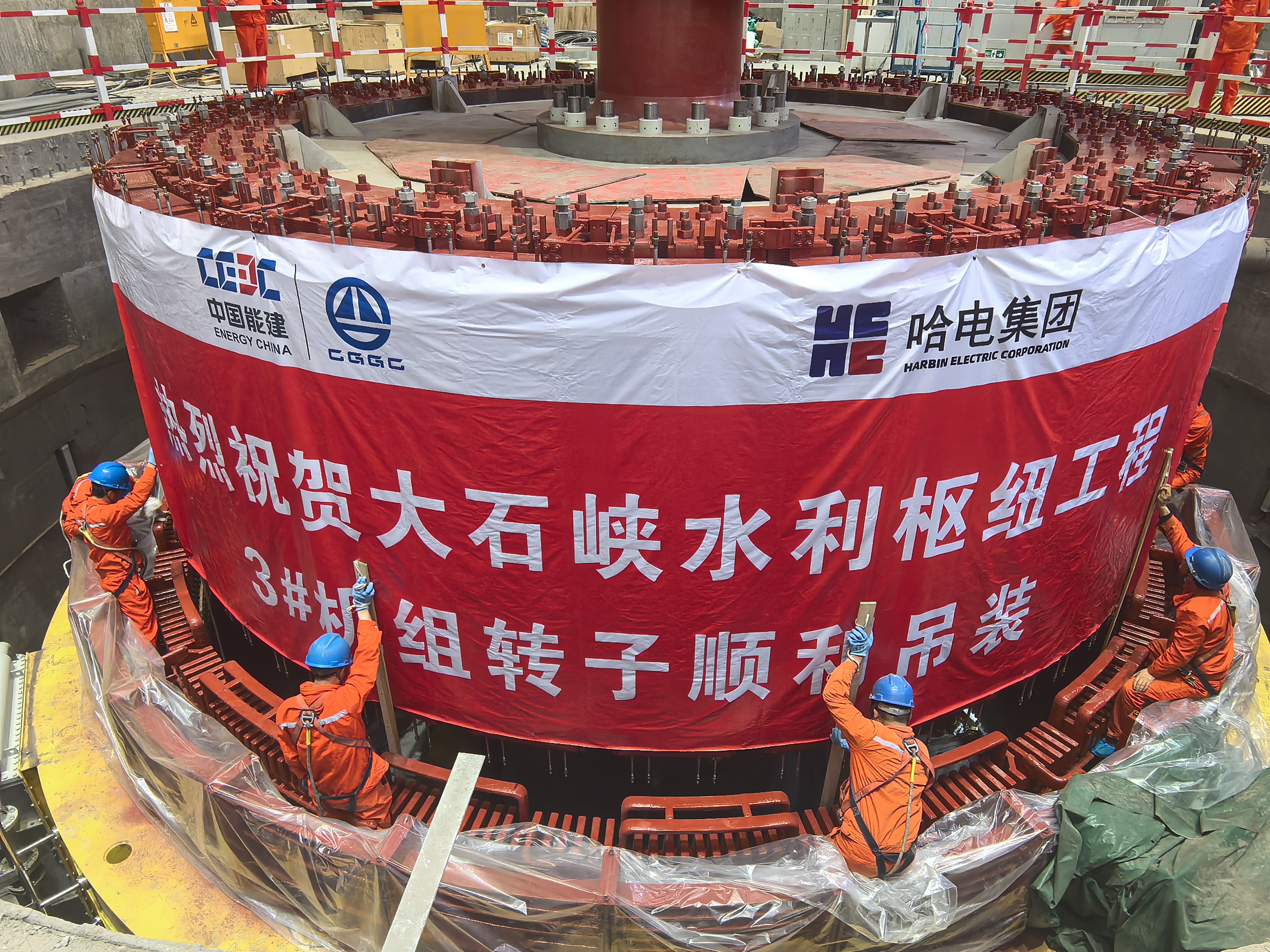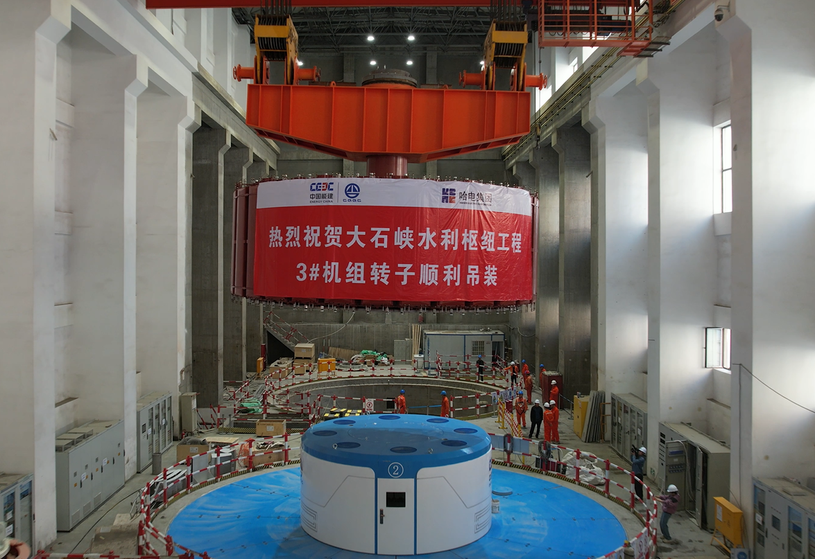 新疆大石峡水利枢纽3号机组转子吊装就位