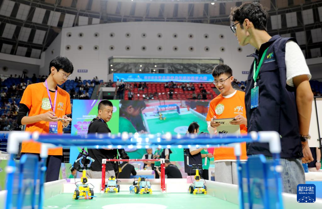 10月3日,在河南省济源市举行的全国青少年科技体育大赛上,参赛选手在进行机器人足球比赛。新华社发(段二平摄)