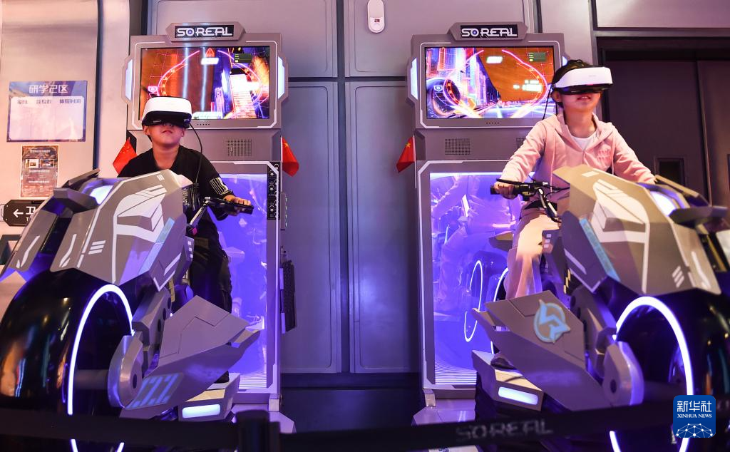 10月4日,在河南省洛阳市涧西区未来城科幻乐园内,孩子们在体验VR虚拟技术沉浸式场景。新华社发(黄政伟摄)