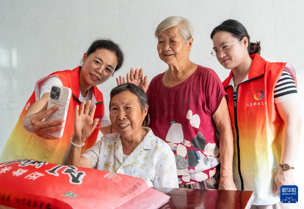 10月5日,江苏省南通市通州区金新街道界北村志愿者帮助老人与远在海外的子女进行视频通话,“云端”相聚,共迎中秋。新华社发(翟慧勇摄)