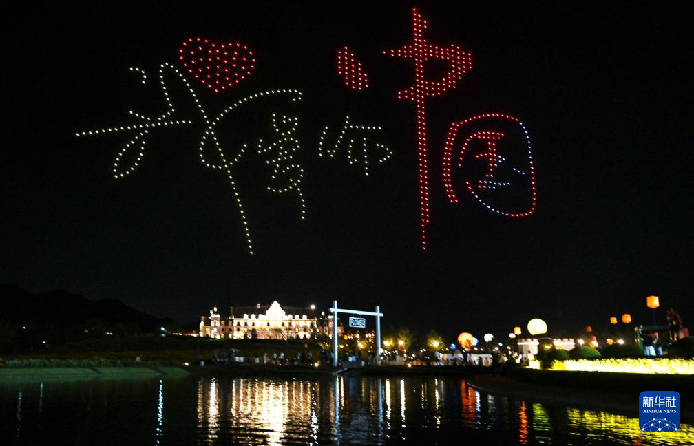 10月4日晚,在浙江省金华市武义县花田美地景区,精彩的无人机表演为游客呈现了一场视觉盛宴。新华社发(张建成摄)