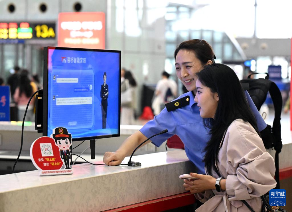 10月5日,在河北石家庄火车站候车大厅服务台,旅客向“AI智能客服机”问询旅行信息。新华社发(陈其保摄)