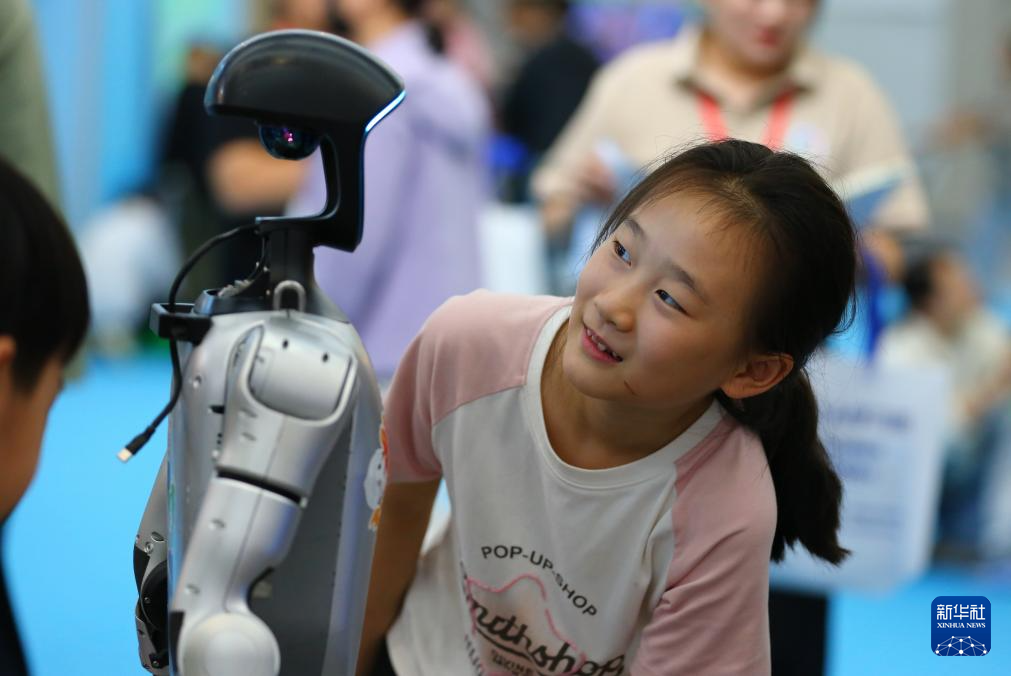 10月2日,在山东省第九届滕州书展现场,小朋友与机器人互动。新华社发(李志军摄)