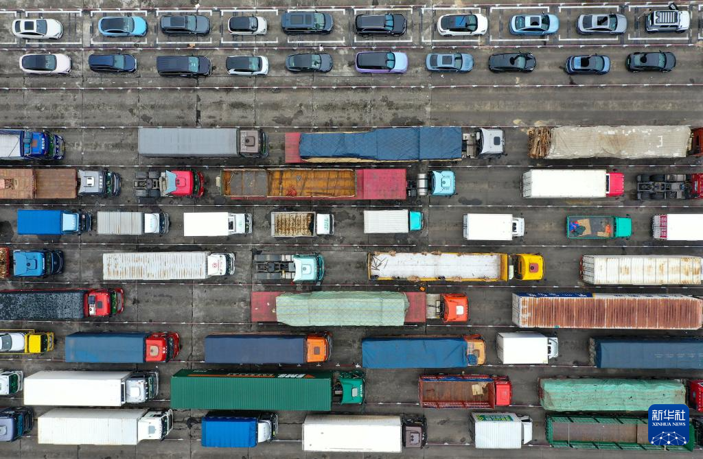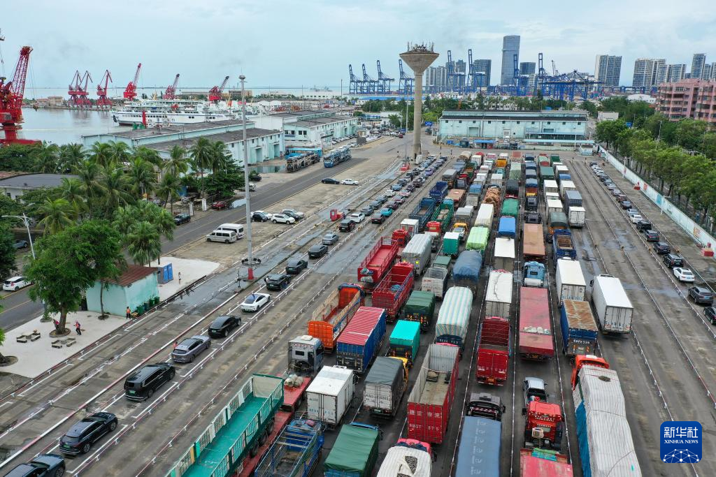 10月6日,在海南省海口市秀英港,车辆等待上船(无人机照片)。新华社记者 郭程 摄
