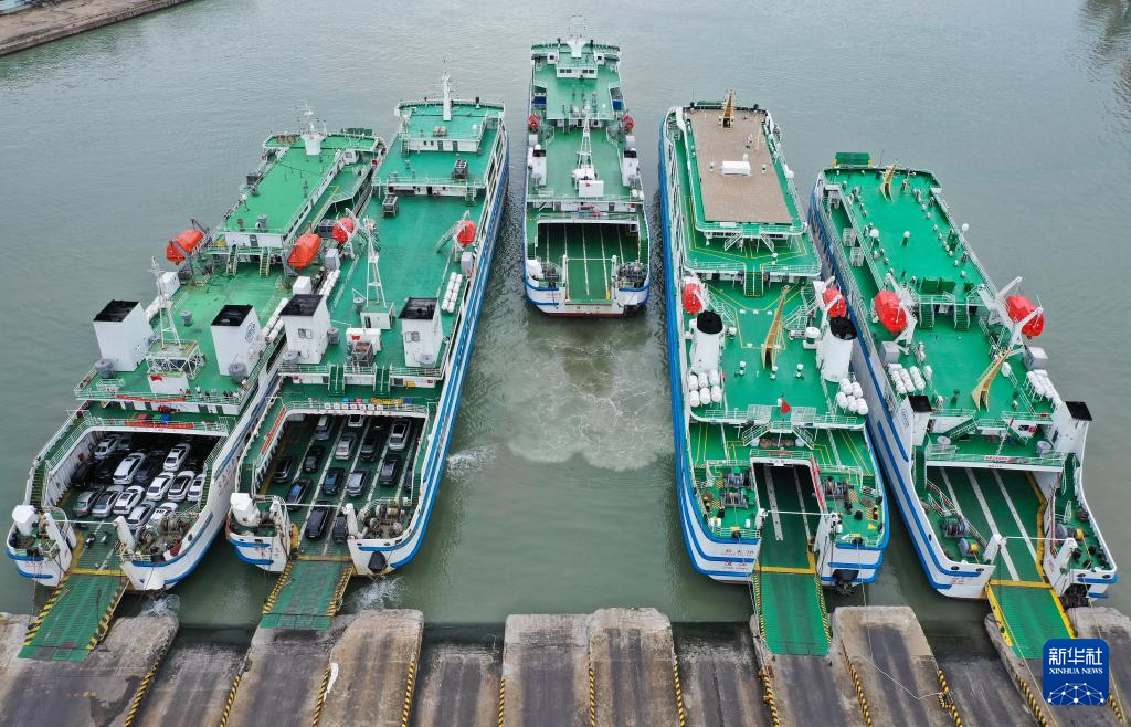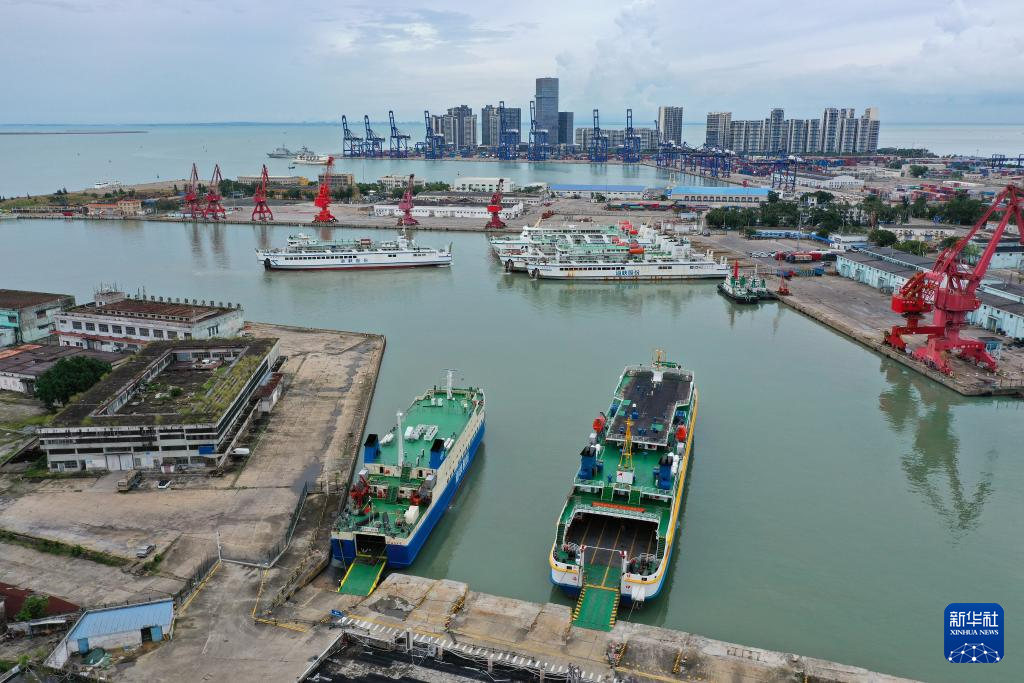 10月6日,在海南省海口市秀英港,客滚船准备装卸车辆(无人机照片)。新华社记者 郭程 摄