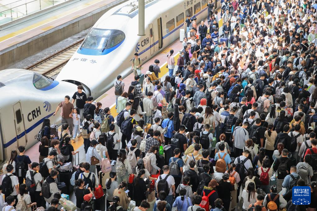 10月8日,旅客在江苏无锡火车站站台乘车。新华社发(还月亮摄)