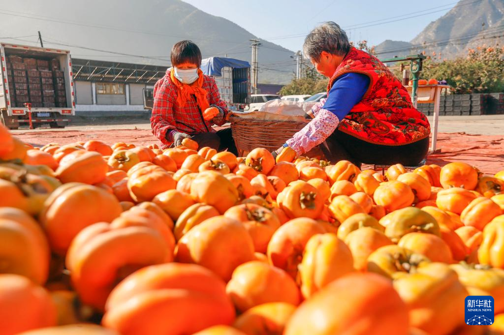11月1日,河北省遵化市娘娘庄镇芦各寨西山村农民在场院挑选柿子。新华社发(刘满仓摄)