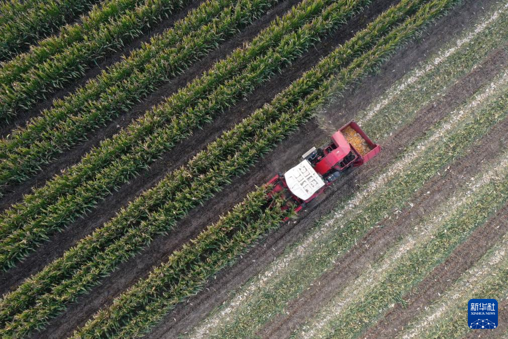 10月30日,农机手驾驶联合收割机在河南省沁阳市崇义镇南范村田间收获玉米(无人机照片)。新华社发(杨帆摄)