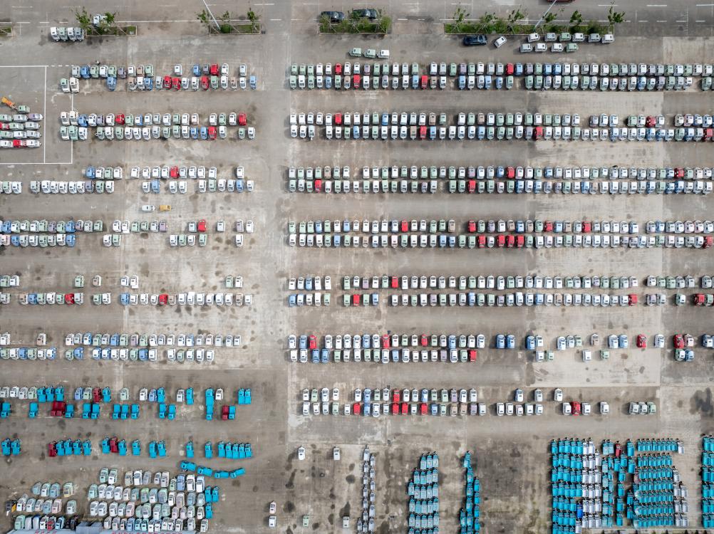 10月16日,江苏省徐州市丰县电动车生产企业内准备发货的电动三轮车。新华社记者 毛俊 摄
