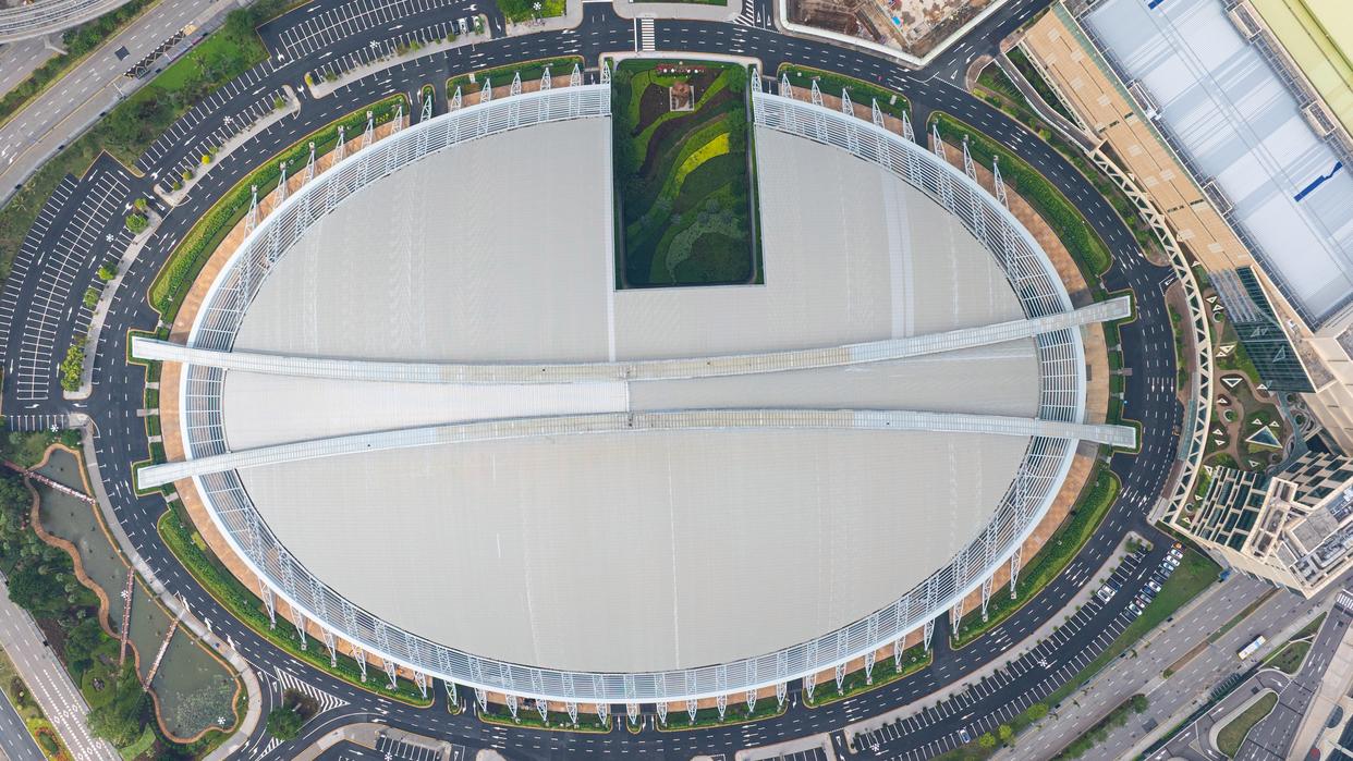 ↑深圳市体育中心(11月2日摄)。全运会羽毛球、射箭、足球男子20岁以下组部分比赛及足球男子18岁以下组部分比赛在这里举行。新华社记者 梁旭 摄