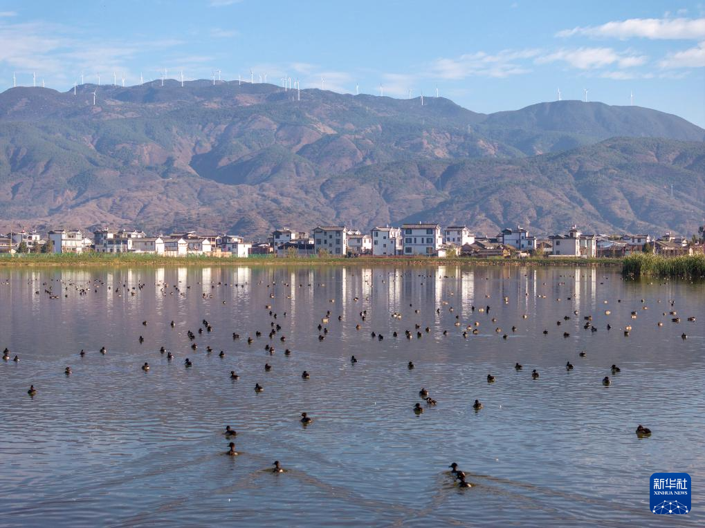 11月30日,在云南省大理白族自治州洱源县永安湿地,群鸟在湿地中觅食(无人机照片)。新华社发(罗新才摄)