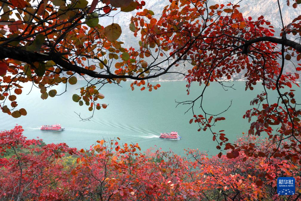 12月7日,船只行驶在红叶映衬下的长江三峡巫峡段。新华社发(王忠虎摄)
