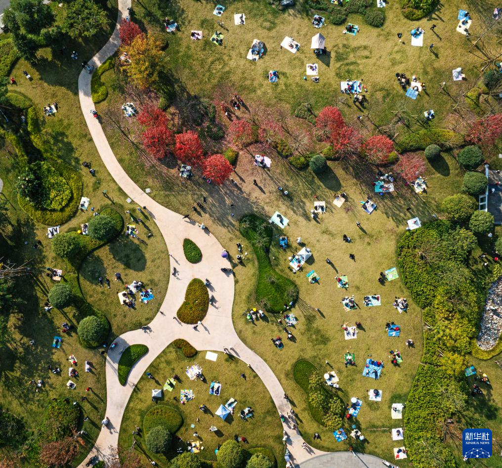 12月7日,游客在四川省乐山市市中区一公园休闲游玩(无人机照片)。新华社发(孔胜摄)