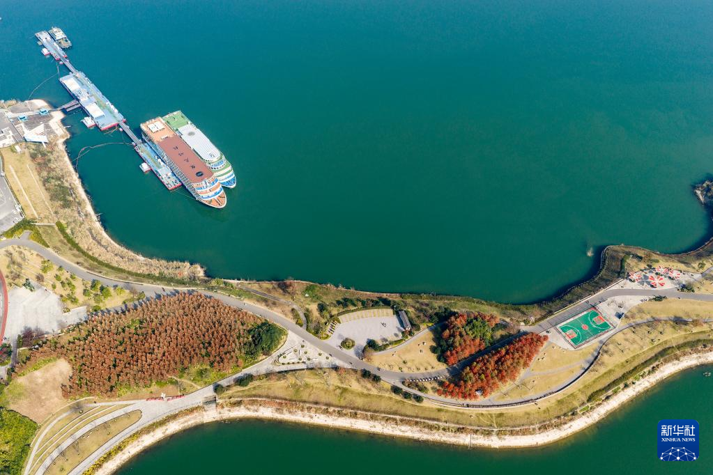 12月7日,游客在浙江省绍兴市上虞区永和镇麻岙水库游玩(无人机照片)。新华社发(胡学军摄)
