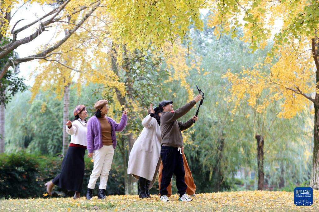 12月6日,市民在四川省乐山市一处银杏树下游玩拍照。新华社发(李华时摄)